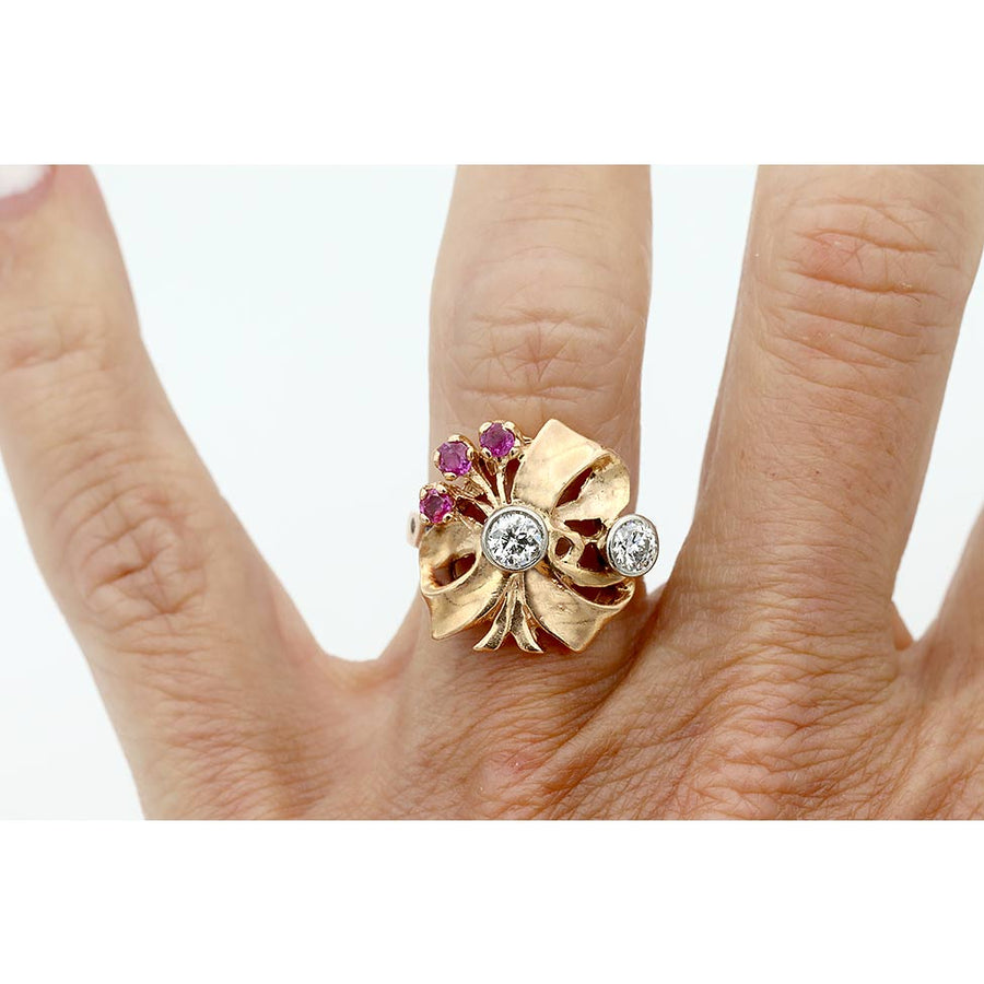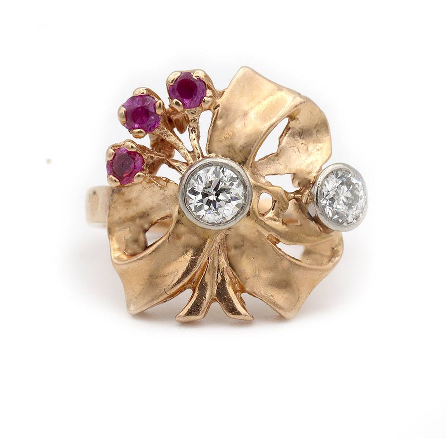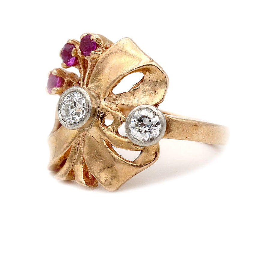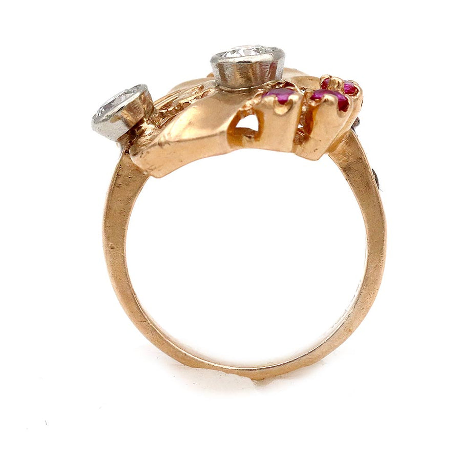 Plucked from your great-grandmother’s jewelry box is the Yana ring! Yana is an enchanting Retro ring featuring two glittering bezel set old European-cut diamonds flanked by three natural pigeon blood Burmese rubies. Beautifully crafted in the 1940s in gleaming 14 Kt rose gold with contrasting white gold accents. A magnificent ring, perfect to wear on either hand! In very good condition.