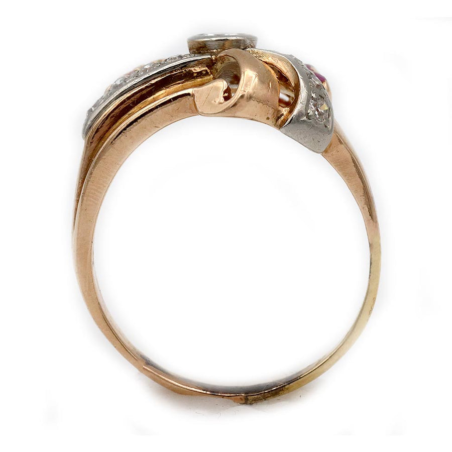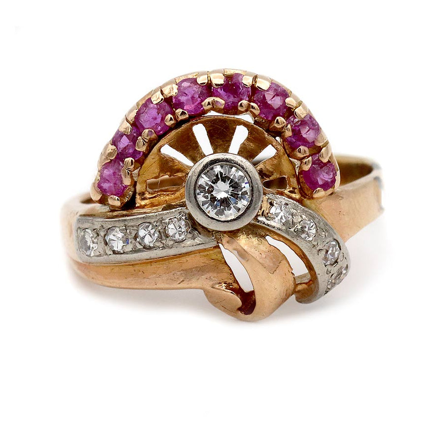 The Eryn ring is an authentic Retro-era vintage jewel dating to the 1940s, designed to command attention. At its center is a bezel-set .25 carat transitional cut diamond, graded H color and SI1 clarity, framed by a striking crescent-shaped motif of eight natural pinkish-red Burma rubies. Accented by eight single-cut diamonds, the design curves gracefully across the finger, creating bold movement and sparkle. Beautifully crafted in glowing 18 karat rose gold with contrasting white gold details, this show-stopping Retro cocktail ring is effortlessly glamorous and looks stunning worn on either hand. Offered in very good condition.