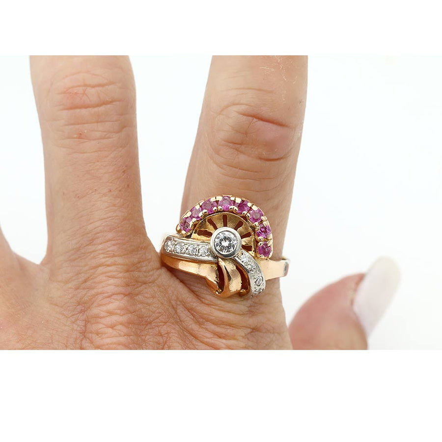 Glamorous Retro Crescent Ruby & Diamond 18K Rose Gold Cocktail Ring – 1.15 CTW