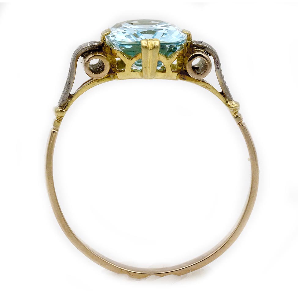 The Shire ring is an authentic vintage engagement ring dating to the 1940s. This lovely Retro-era ring features a sky-blue natural cushion cut aquamarine weighing approximately 3.90 carats, flanked by four natural rose cut diamond accents that add soft antique sparkle. Beautifully crafted in a 14 karat two-tone gold setting, the ring is finished with delicate milgrain and filigree engraving that enhances its vintage character. A graceful and eye-catching gemstone ring, offered in very good vintage condition.