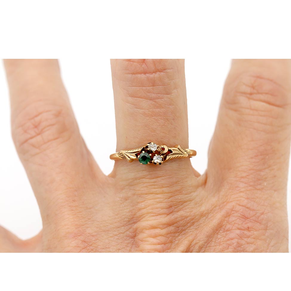 The Hahn ring is an authentic Victorian engagement ring circa 1900s. This ring features two (2) vintage rose cut diamonds and one green garnet doublet. Handcrafted in 10 karat rose gold and accentuated with filigree engravings, this is a sweet Victorian piece, in very good condition.