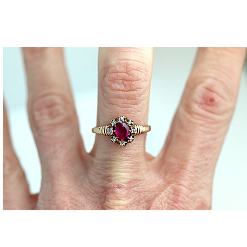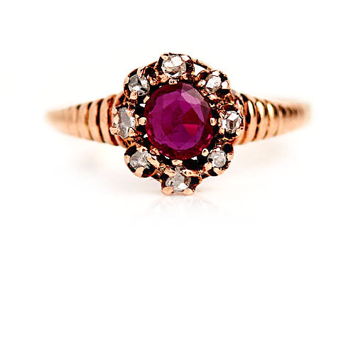 The Peni ring is an authentic vintage engagement ring circa 1940's. The ring features a natural .65 carat round cut Burma ruby, surrounded by a delicate halo of 8 rose cut diamond accents.  This dreamy pigeon blood ruby resides in a 10 karat ribbed rose gold setting.  A beautiful ring, very hard to find, and in excellent condition.