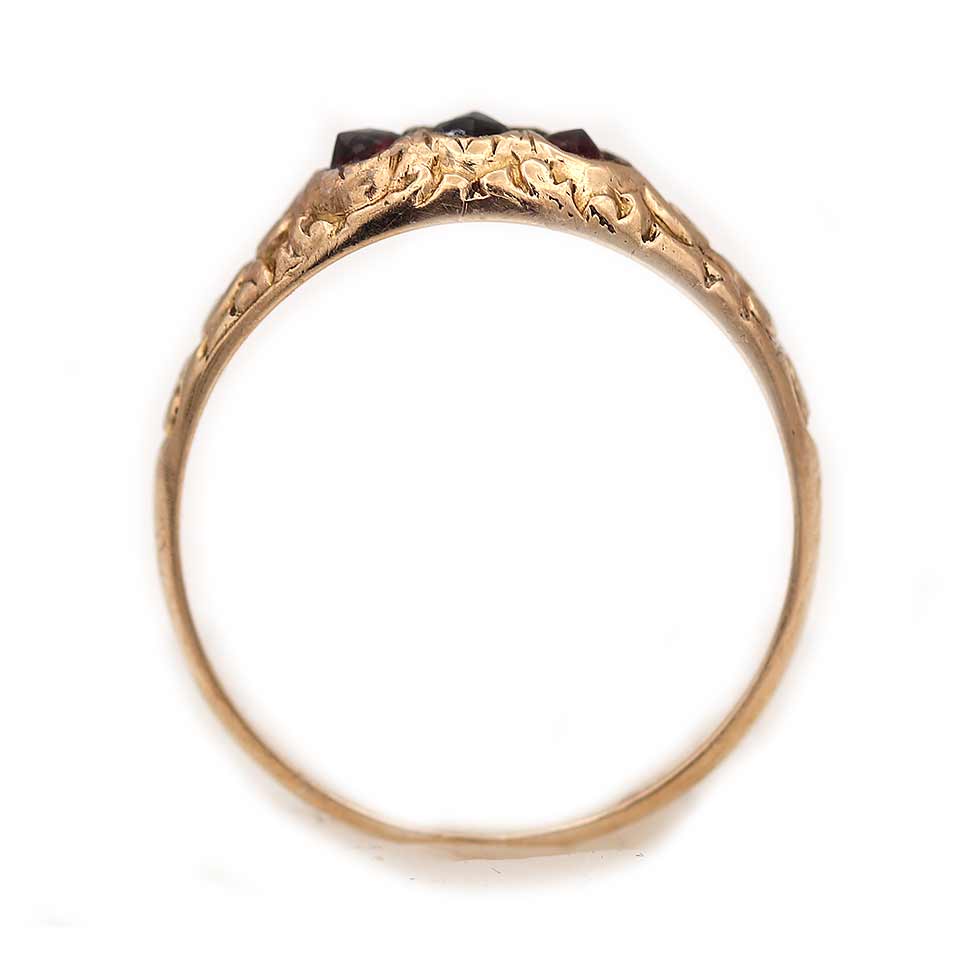 The Calhoun ring is an authentic Victorian wedding ring, circa 1900's, featuring three (3) natural vintage garnets. Beautifully crafted in 10 kt rosy yellow gold, and accentuated with delicate filigree engravings, this ring is as lovely and dainty as can be. In very good condition.
