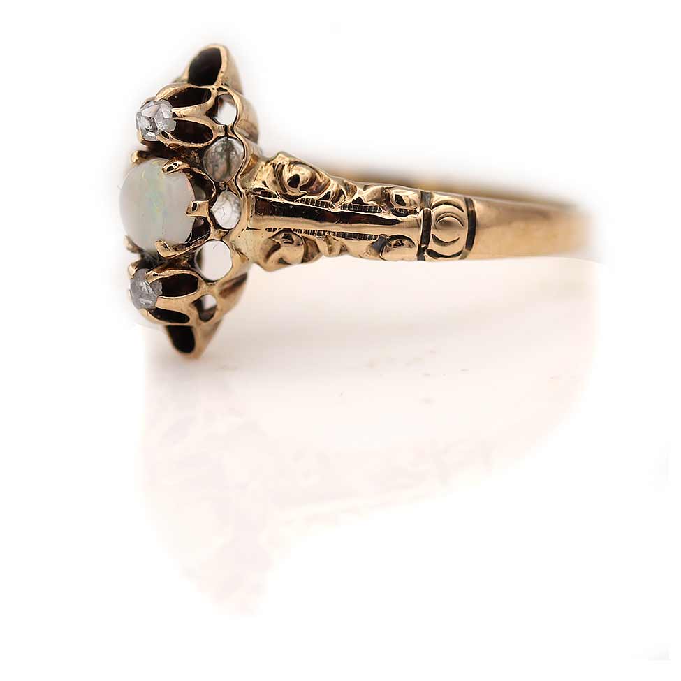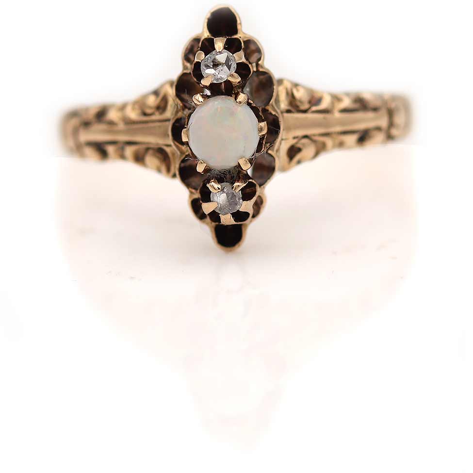 The Weston ring is an authentic vintage opal engagement ring from the Victorian era, circa 1900s. This ring features a natural .35 carat opal surrounded by two (2) north-south set rose cut diamond accents. Beautifully crafted in 10 kt rosy-yellow gold, and accentuated with delicate filigree engravings. As sweet as can be and in very good condition.