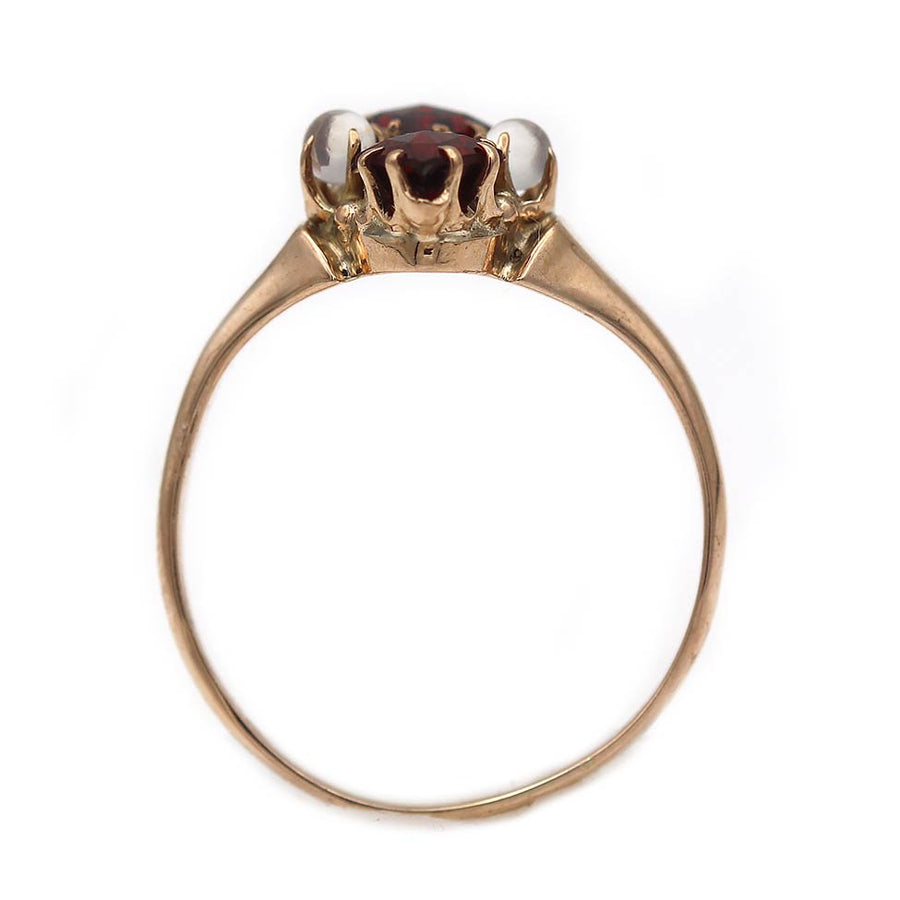 The Chiarra ring is an authentic vintage garnet engagement ring circa 1940's. The ring features 2 deep red natural kite shaped garnets, weighing approximately .60 carats, flanked by 2 natural round cut moonstones. Beautifully crafted in 10 kt rose gold. In very good condition.