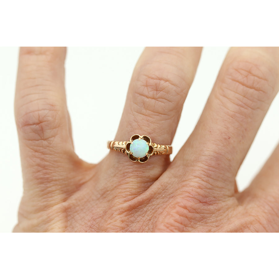 The Natash ring is an authentic Victorian engagement ring, circa 1900's. featuring a .50 carat natural cabochon opal set within six (6) knife edge prongs within a Victorian buttercup setting. Beautifully crafted in 10 kt rose gold, and accentuated with delicate filigree engravings, this is a sweet dainty piece. In very good condition.