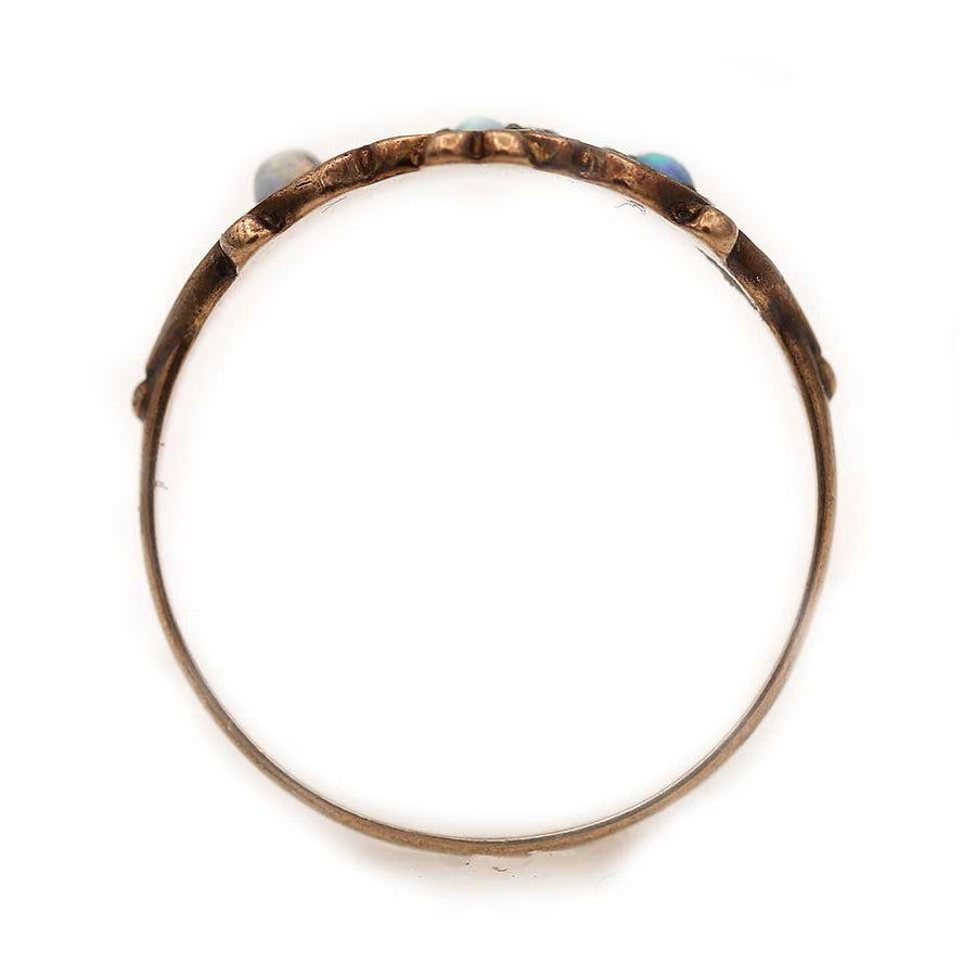 The Wilson ring is an authentic Victorian opal engagement ring, circa 1900's, featuring 3 natural bezel set cabochon opals. Beautifully crafted in in gleaming 10 kt rosy-yellow gold, and accentuated with delicate starburst engravings, this is a sweet original Victorian ring with the perfect amount of patina. Very hard to find and in good condition.