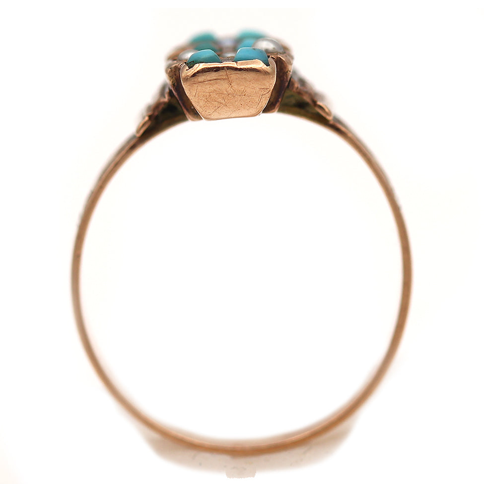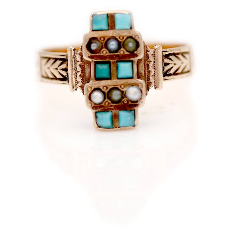 The Desmond ring is an authentic vintage engagement ring from the Victorian era, circa 1900's. This ring features six (6) vintage, bezel set, cabochon turquoise and six (6) seed pearls. Beautifully crafted in gleaming 10 kt rosy-yellow gold, and accentuated with delicate filigree engravings, this is a rare and delicate Victorian piece, in very good condition. As sweet as can be.