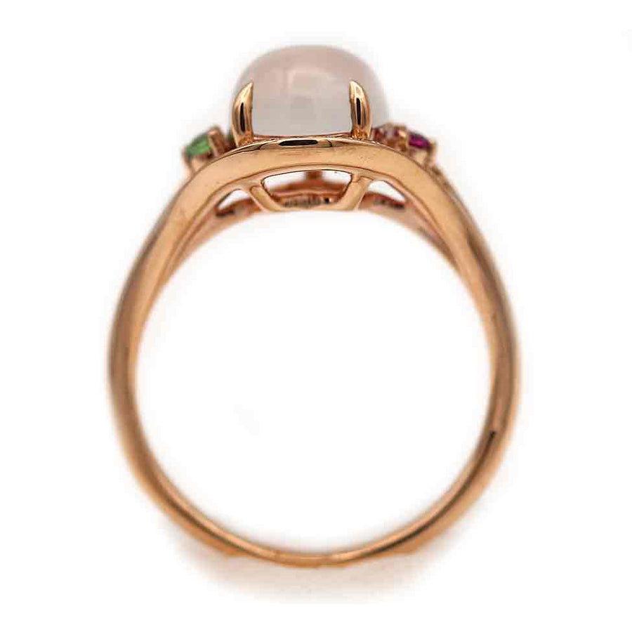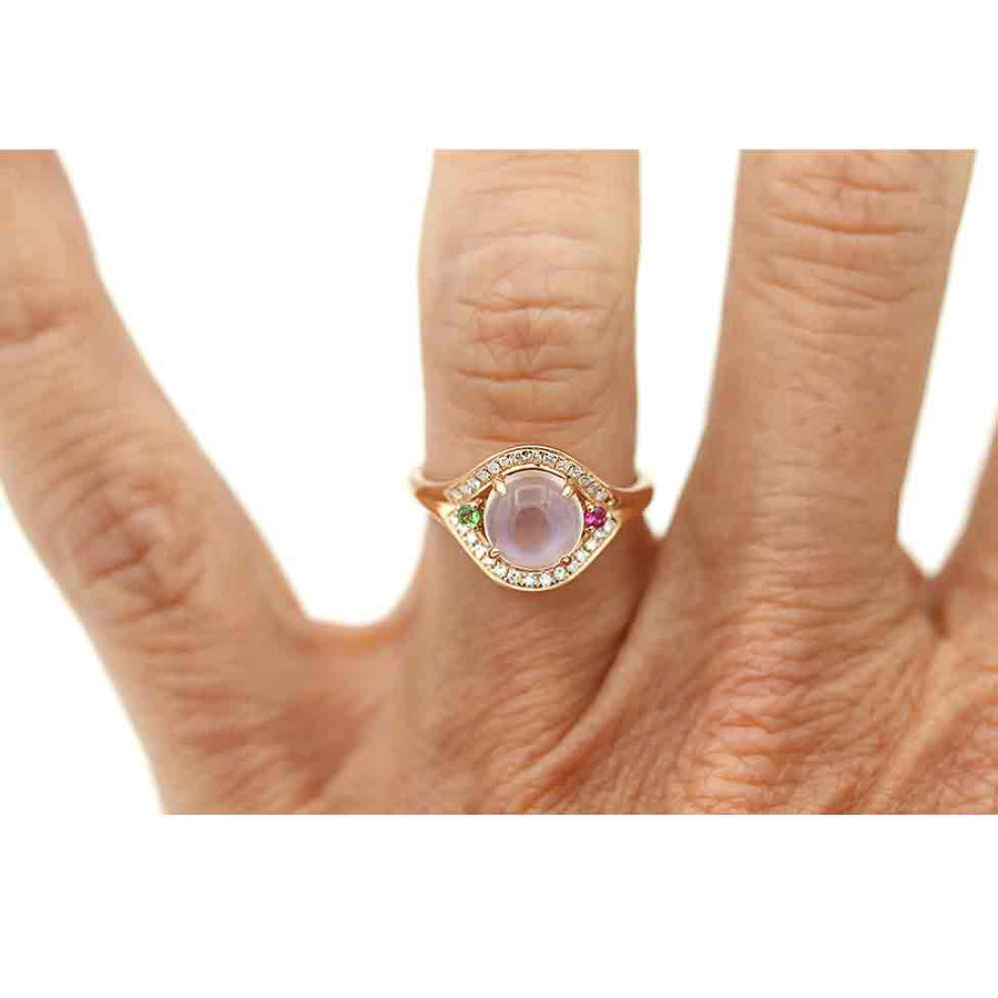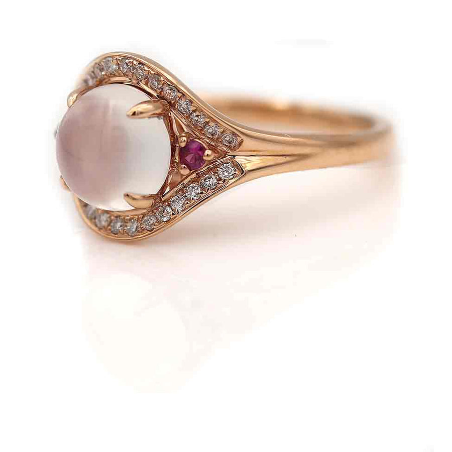 The Violarana ring is an authentic vintage moonstone engagement ring from the 1990's. This ring features a natural 1.25 cabochon moonstone, flanked by two (2) tiny irradiated round cut diamonds and surrounded by twenty eight (28) pave set round cut diamonds. Beautifully crafted in 14 kt rose gold. As sweet as can be. Perfect to wear on either hand. Very hard to find and in very good condition.