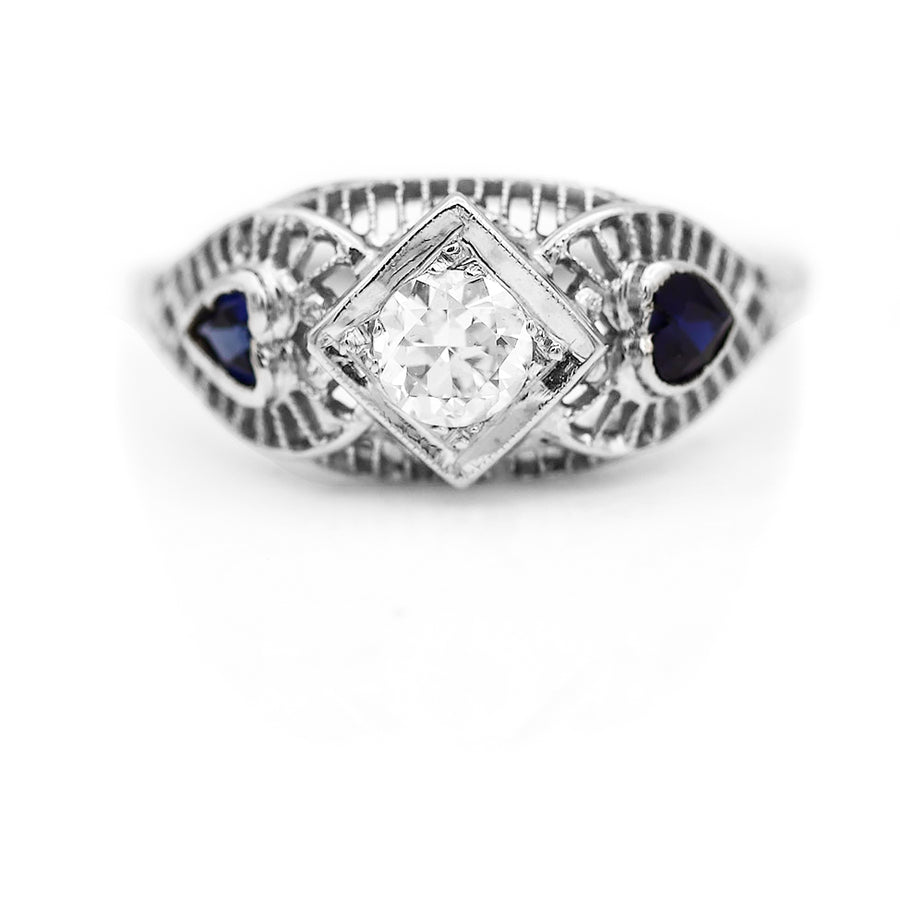 The Tara ring is an authentic antique engagement ring from the Art Deco era circa 1930's. The ring features a .25 carat old European cut diamond of F color SI1 clarity, residing in a geometric 4-sided frame. The diamond is flanked by 2 synthetic bezel set heart shaped sapphire accents. Beautifully crafted in 14 karat white gold, accentuated with open metal work and delicate filigree engravings. A magnificent vintage ring. Timeless in every way. In excellent condition.