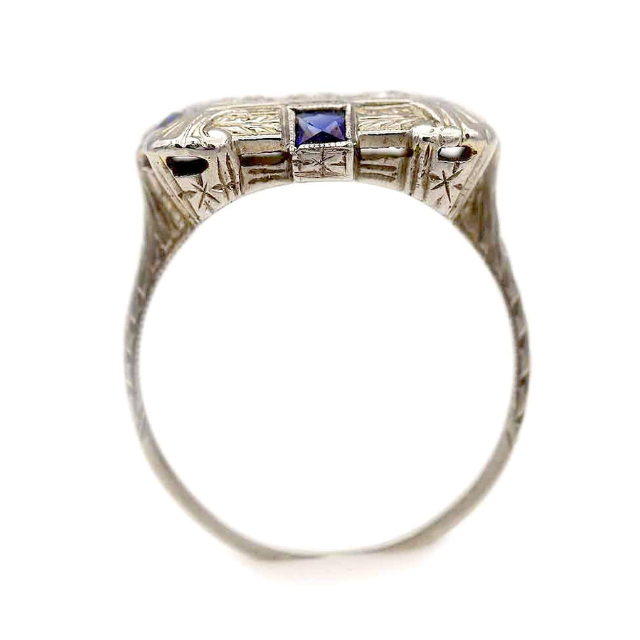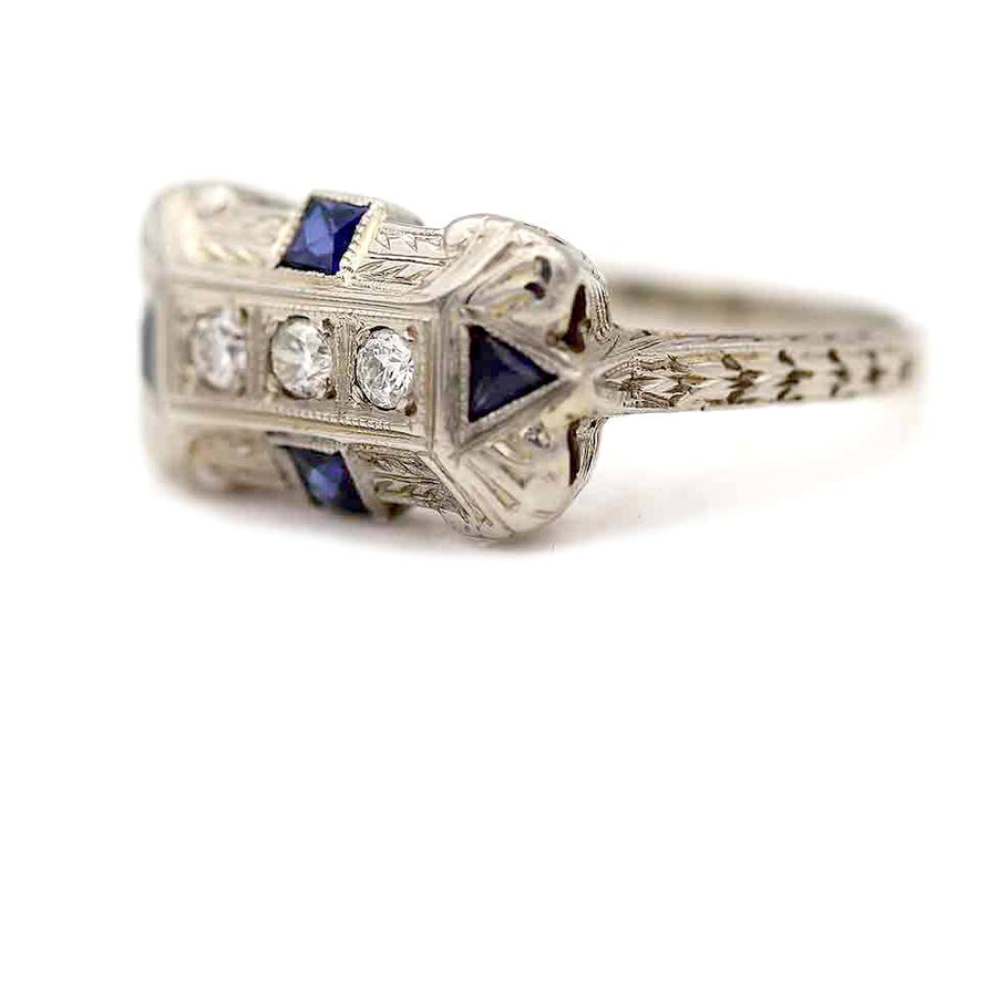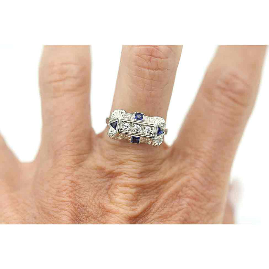The Ventagia ring is an authentic Art Deco engagement ring, circa 1920's. This stunning ring features three (3) old European cut diamonds surrounded by two (2) square cut and two (2) triangle vintage synthetic sapphires Beautifully crafted in gleaming 18 karat white gold. An Art Deco jewel! Perfect to wear on either hand. In very good condition.