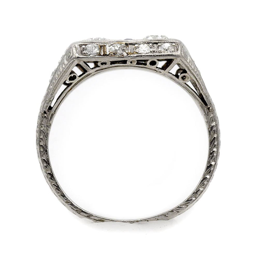The Amisha ring is an authentic vintage engagement ring from the Art Deco era circa 1930s. The ring boasts a pair of glittering old mine cut diamonds residing in a pair of geometric square milgrain frames. Two vintage synthetic baguette sapphires are placed beautifully in between 2 European cut diamonds, surrounded by 12 mine cut and single cut diamond accents. Crafted in platinum, accentuated with intricate filigree engravings and delicate swirls of metal work. A bold, one of a kind vintage ring. In very good condition.