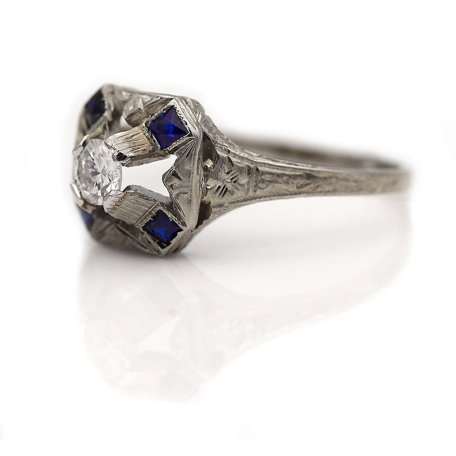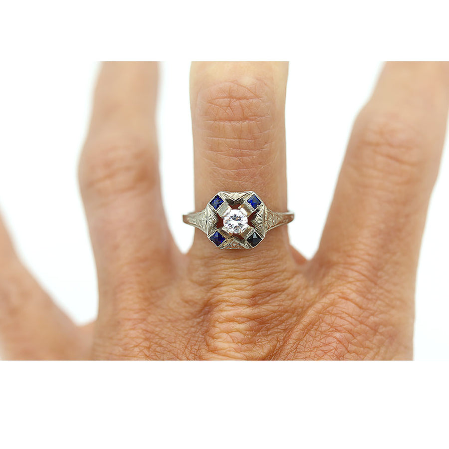 The Judi ring is an authentic antique engagement ring from the Art Deco circa 1920s. The ring showcases a bright-white .30 old European cut diamond of G color, SI1 clarity, surrounded by 4 synthetic square cut sapphire accents. Crafted in 14 karat white gold, adorned with delicate filigree engravings. An Art Deco dream ring. In pristine condition.