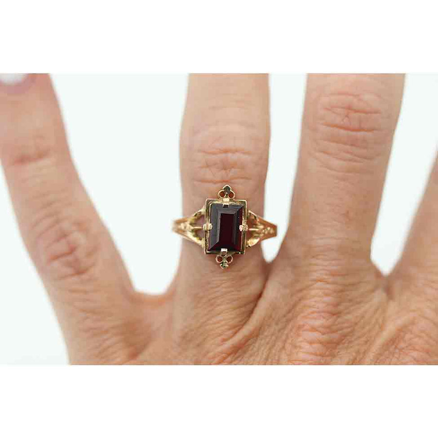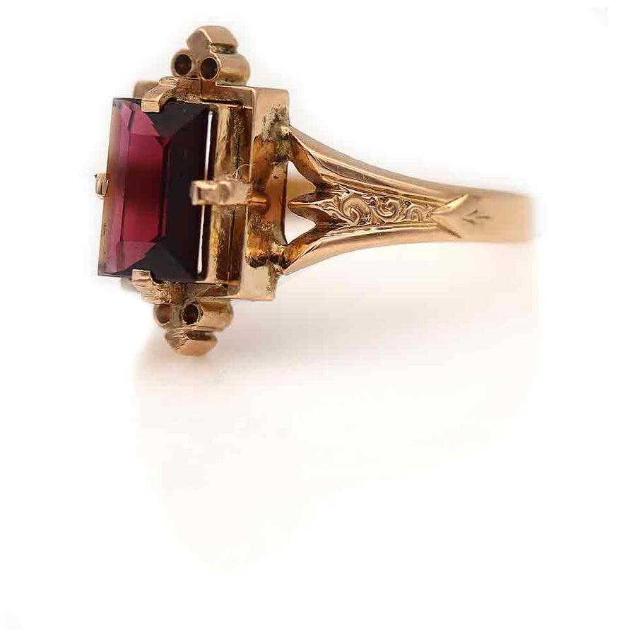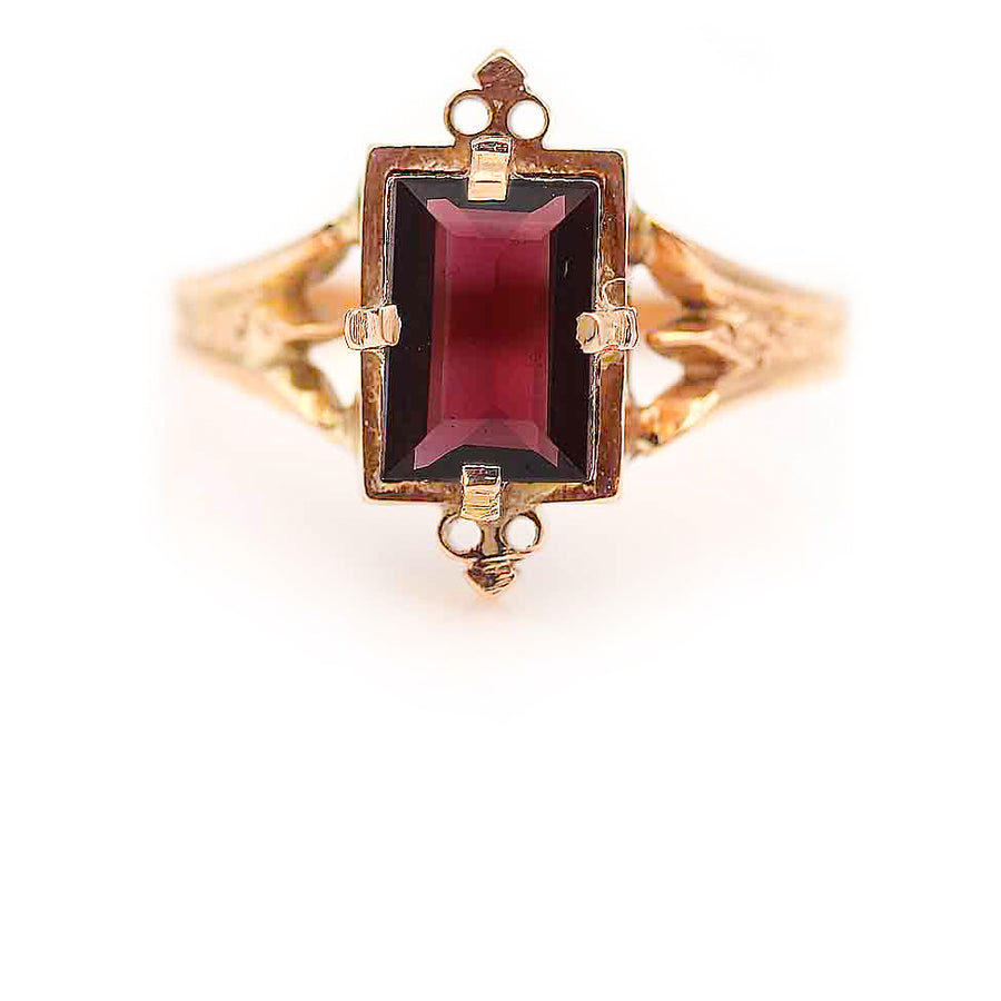 The Sarfe ring is an authentic Victorian garnet engagement ring, circa 1900s, featuring a natural 1.25 carat rectangular cut purple garnet. Beautifully crafted in 10 kt yellow gold, and accentuated with delicate filigree engravings and open metal work. A beautiful vintage piece, perfect to wear on either hand. In very good condition.
