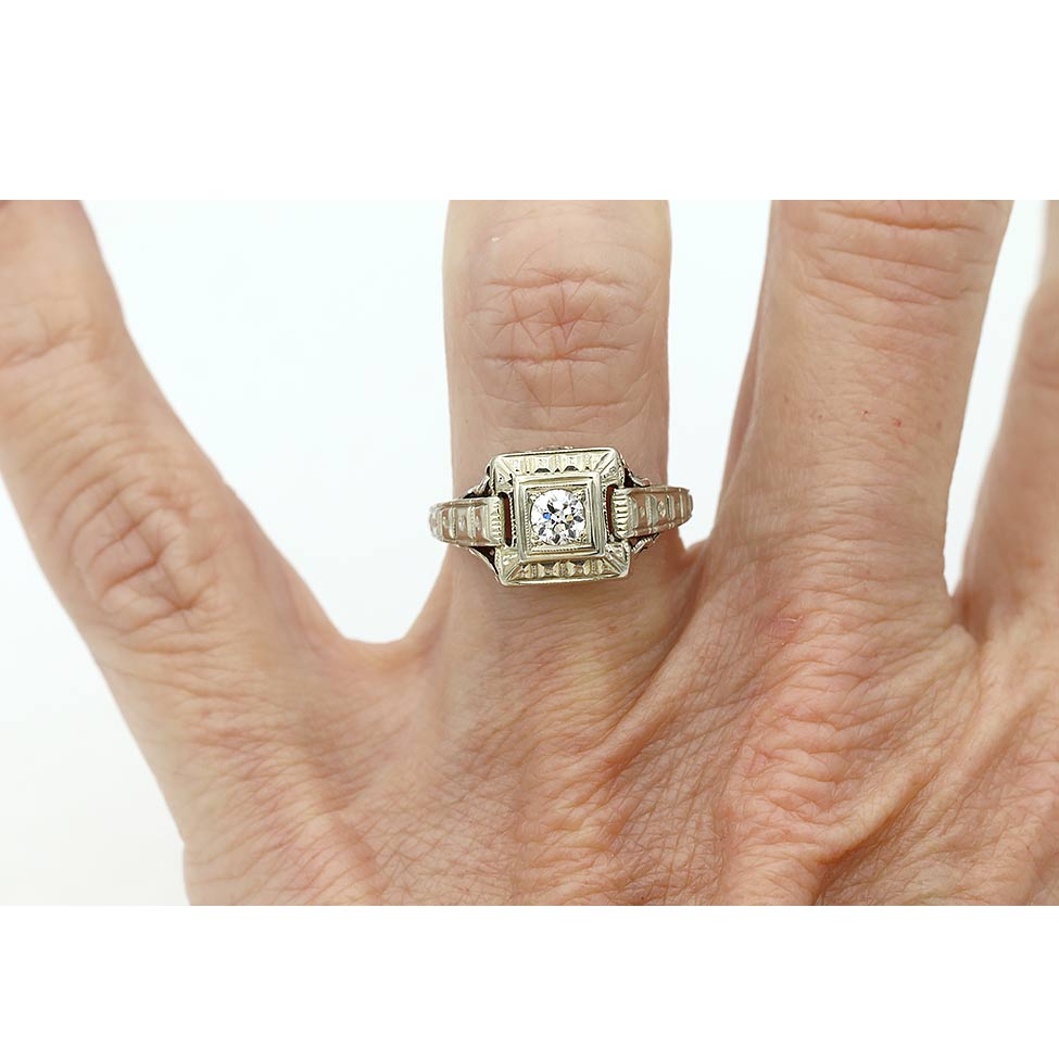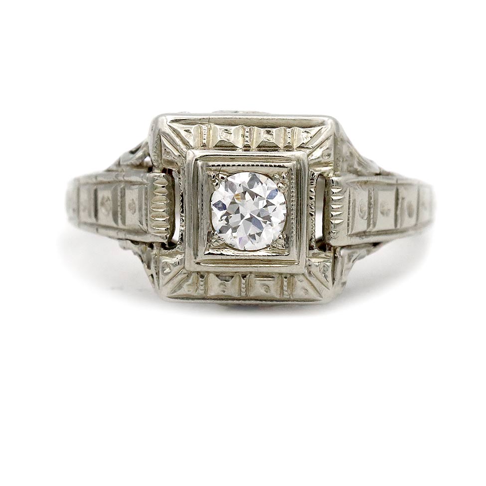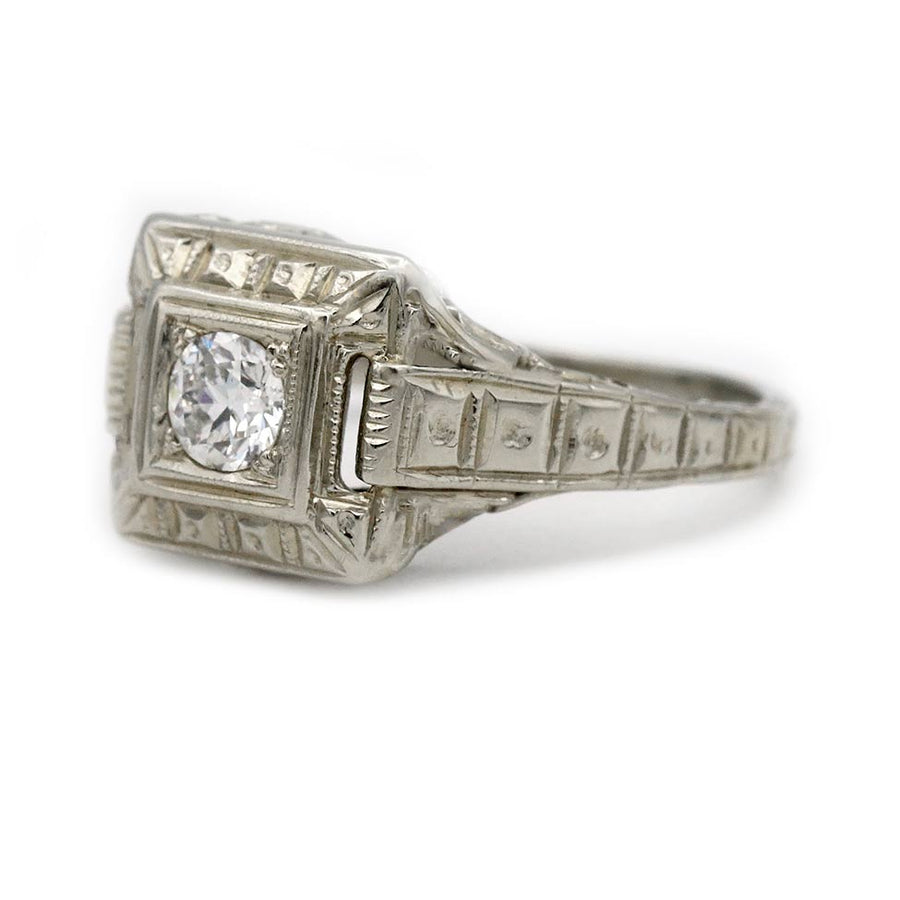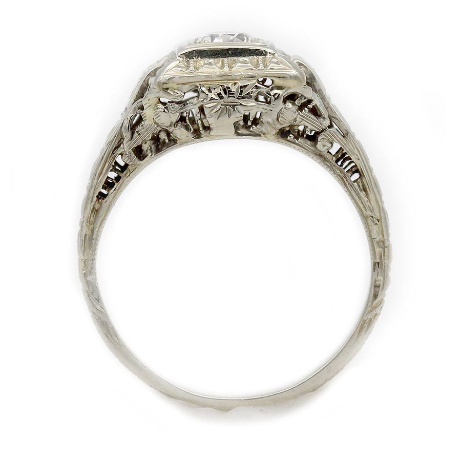 Antique .25 Ct Square Old European Cut Diamond Art Deco Engagement Ring in 18 Karat White Gold with Filigree