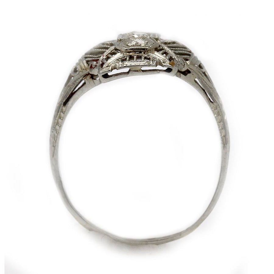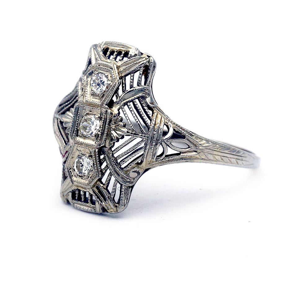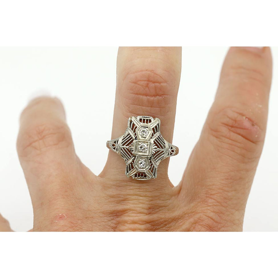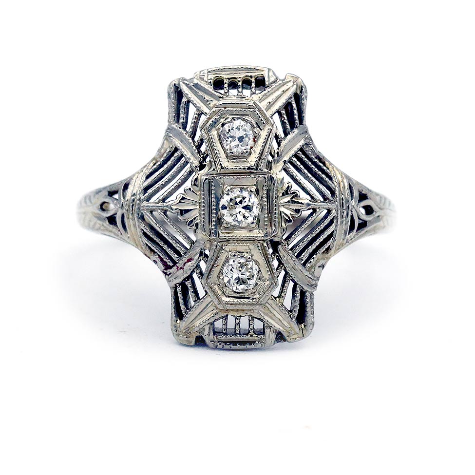 The Alexa ring is an authentic Art Deco cocktail ring circa 1930's. The ring features 3 centered old European cut diamonds, residing in geometric milgrain frames, flanked by filigree engravings. Crafted in 18 karat white gold, accentuated with intricate open metal work and milgrain engravings. A magnificent and rare Art Deco ring, with beautiful detailing. Perfect to wear on any hand. In very good condition.