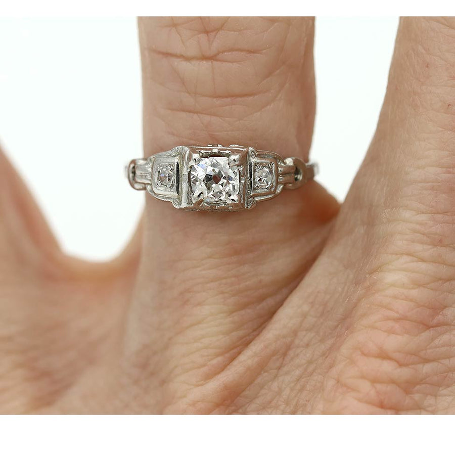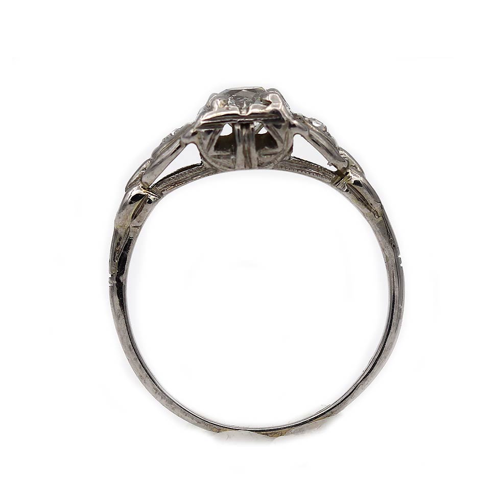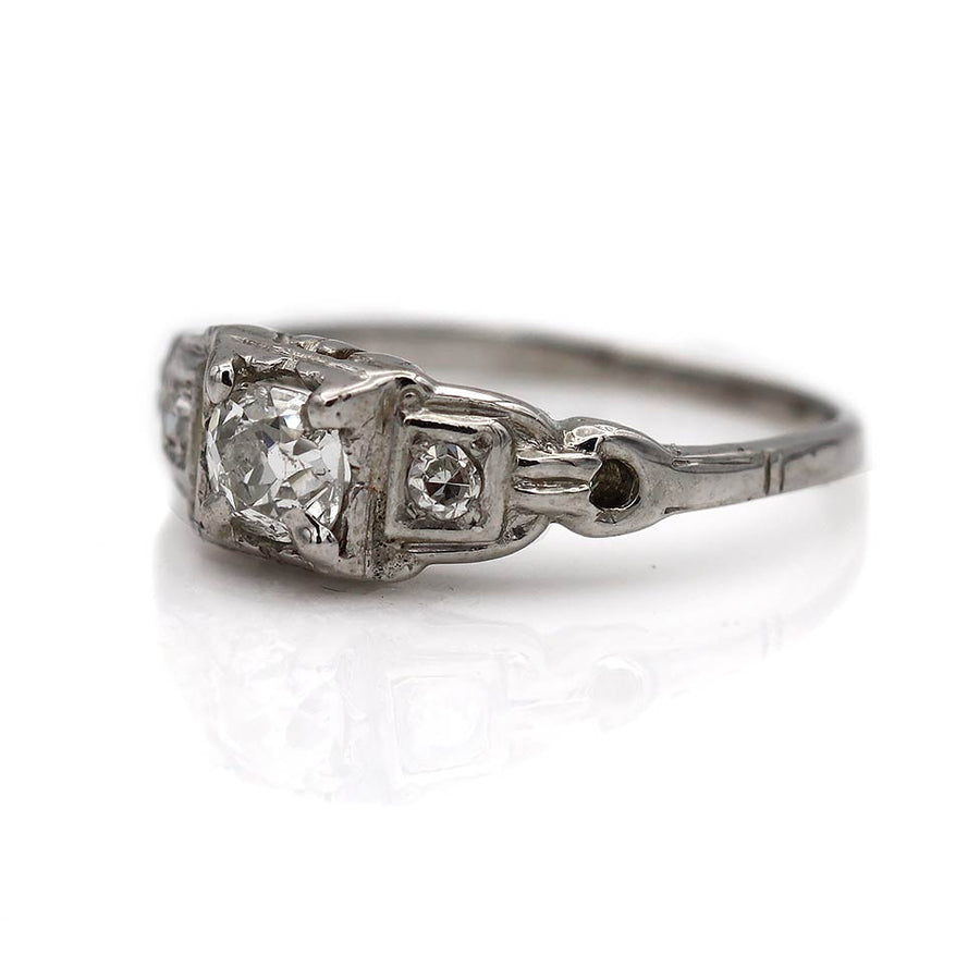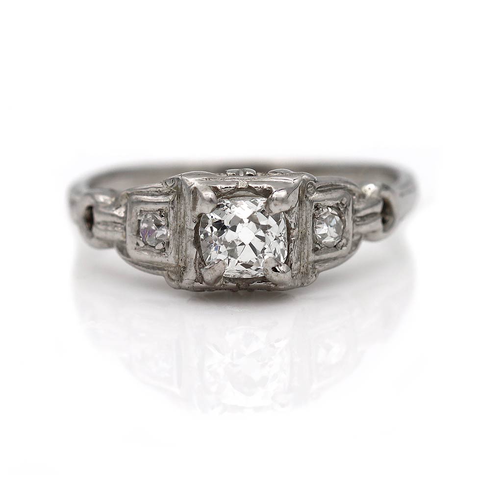 The Rennie ring is an authentic vintage engagement ring from the Art Deco era. The ring features a glittering .40 carat old mine cut diamond of H color, SI1 clarity, residing within knife edge prongs. The diamond is flanked by 2 single cut diamond accents. Crafted in the 1920's in 14 karat white gold. A fabulous low profile vintage find. In very good condition.