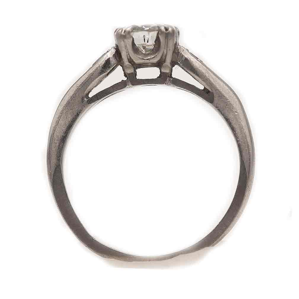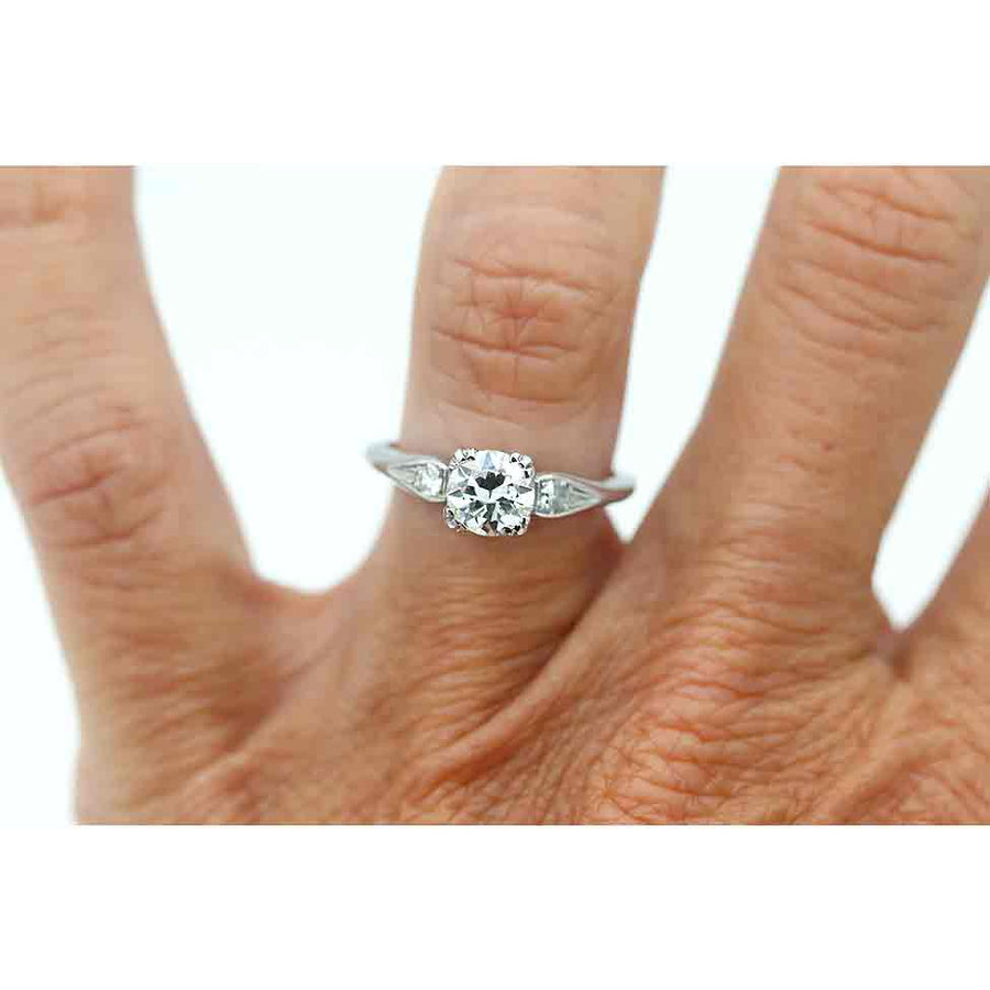 The Kate B ring is an authentic vintage engagement ring from the Art Deco era, circa 1930's. This ring features a glittering .74 carat GIA old European cut diamond of H color and SI2 clarity, flanked by two (2) single cut diamond accents. Beautifully crafted in platinum. Perfect to wear on either hand. In very good condition.