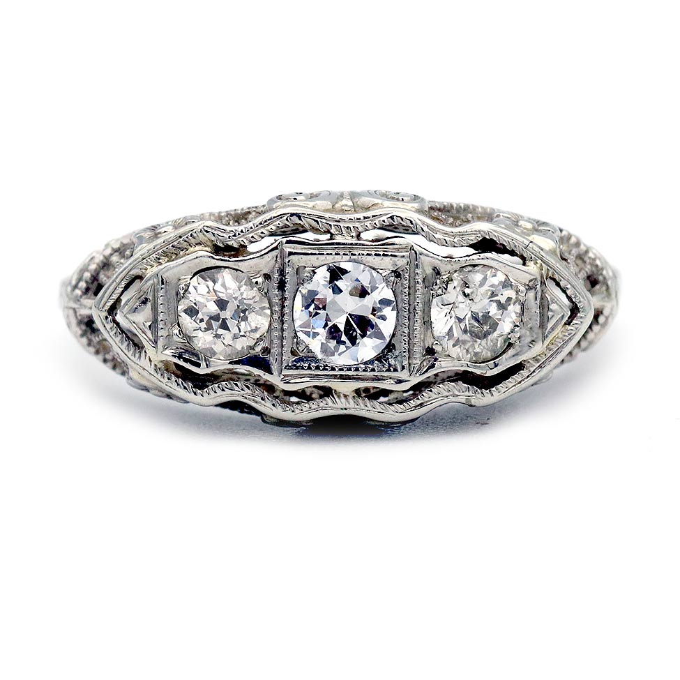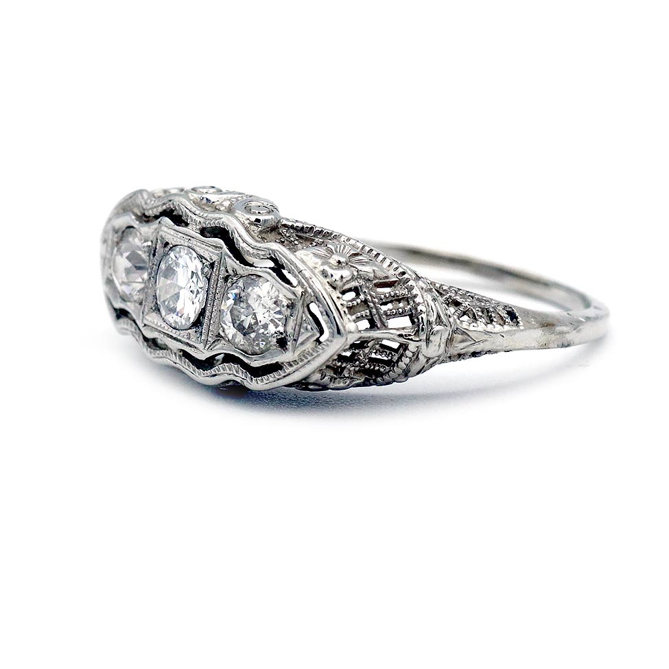 The Kellie ring is an authentic vintage engagement ring from the Art Deco era circa 1930's. The ring features a trio of old European-cut diamonds, weighing .50 carat of G color, SI1- SI2 clarity. Beautifully crafted in 14 karat white gold, accentuated with swirls of metal work and floral engravings. A stunning, one of a kind ring. In pristine condition.