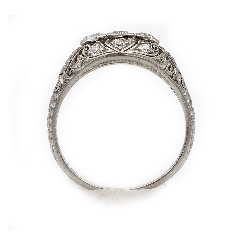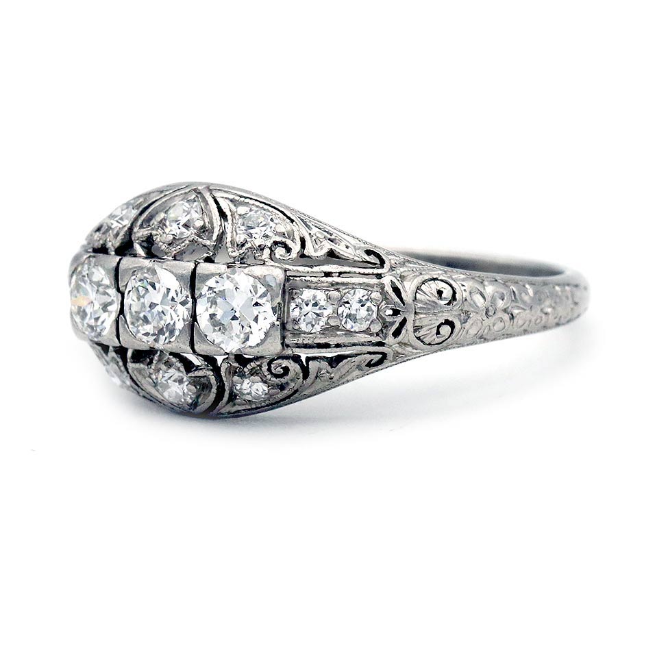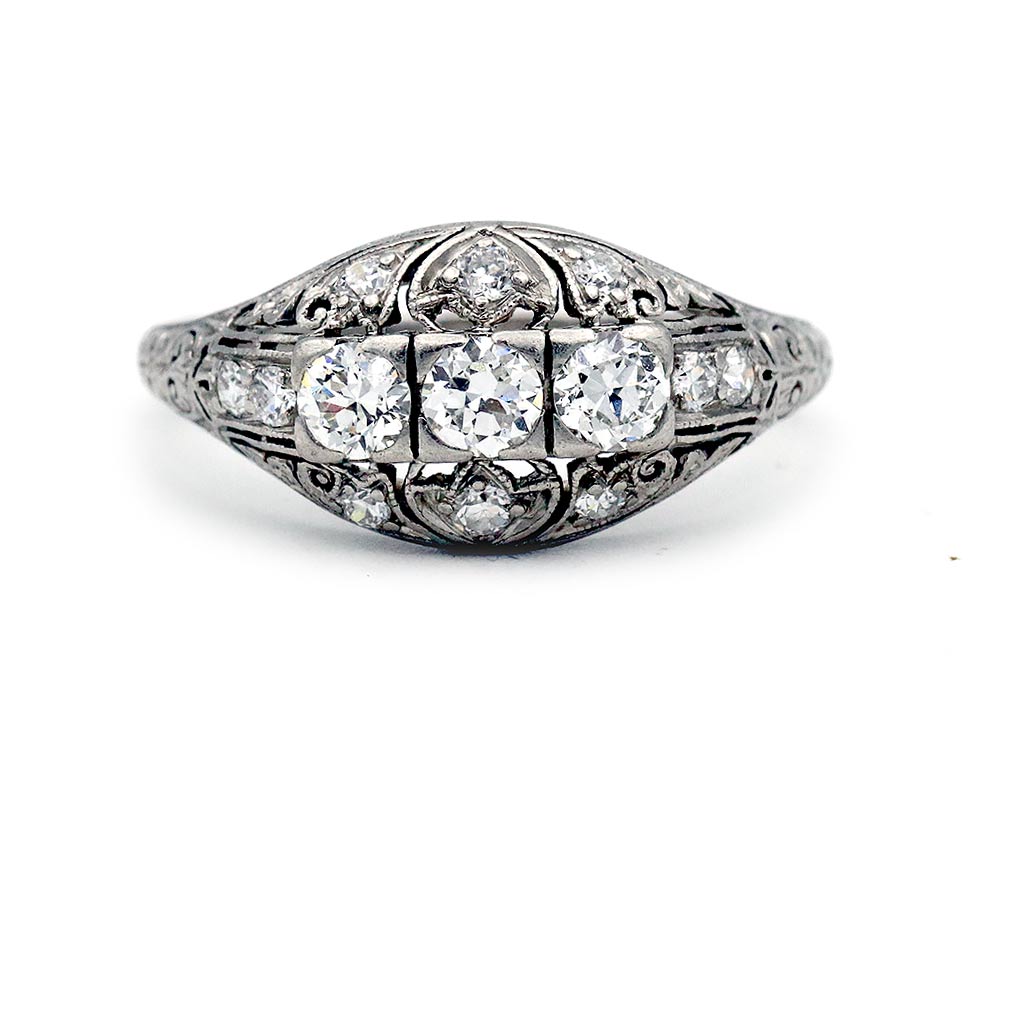 The Caldwell ring is an authentic Art Deco diamond engagement ring circa 1930s signed J.E Caldwell. The ring feature 3 centered old European cut diamonds weighing .50 carat. The diamonds are surrounded by 10 old European cut diamond accents. Masterly crafted in platinum, accentuated with scrolls of intricate metal work and filigree engravings. Rare, timeless and in pristine condition. Magnifique! Signed and Stamped J.E. Caldwell.