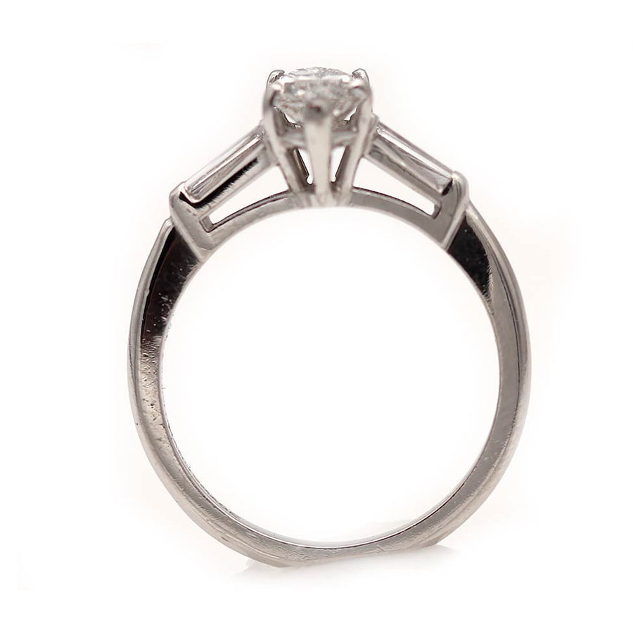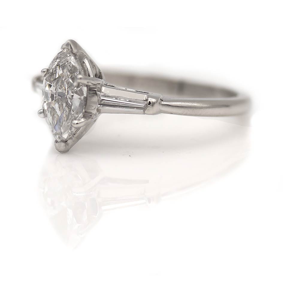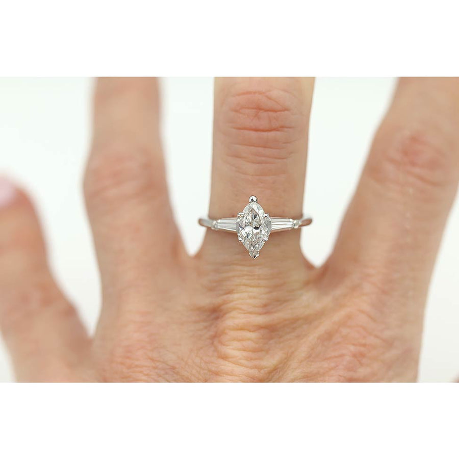 The Lunia ring is an authentic vintage engagement ring, circa 1970s, featuring a bright-white, GIA certified .96 carat marquise cut diamond of G color and I1 clarity, flanked by two (2) tapered baguette diamonds. Crafted in platinum, this is a timeless and classic 3 stone ring. In very good condition.