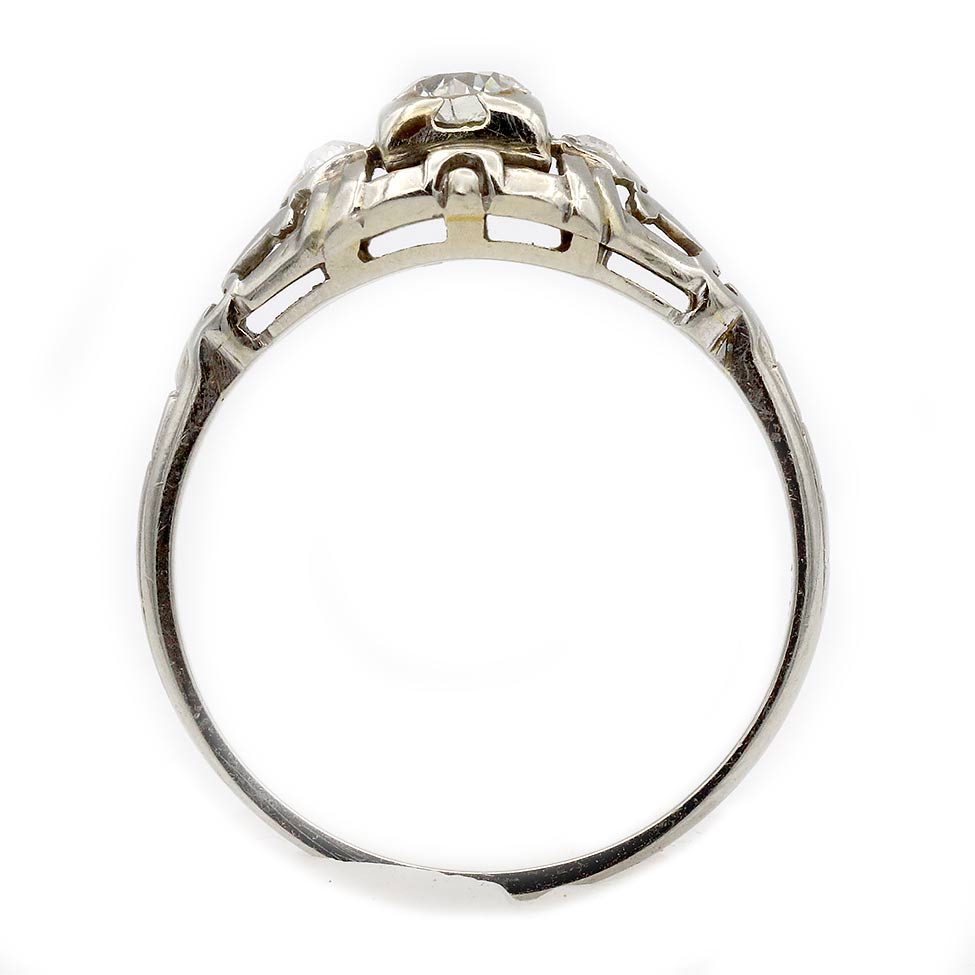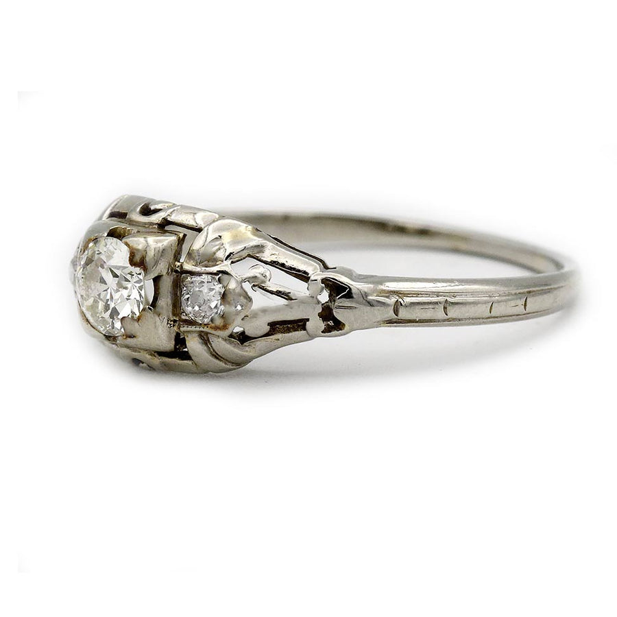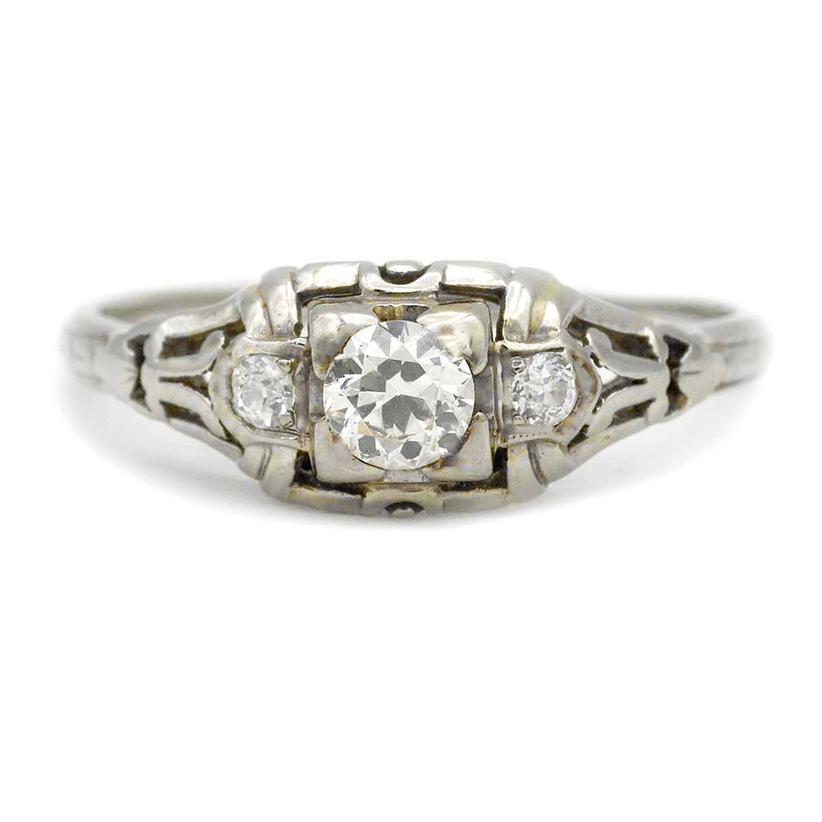 The Deanne ring is an authentic vintage engagement ring from the Art Deco era circa 1920's. This unique three stone diamond engagement ring features a .35 carat old European cut diamond of H color, VS2 clarity, residing in a geometric square frame. The diamond is flanked by 2 old European cut diamond accents. Crafted in 18 karat white gold. A true classic. In very good condition.