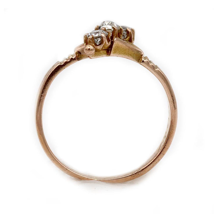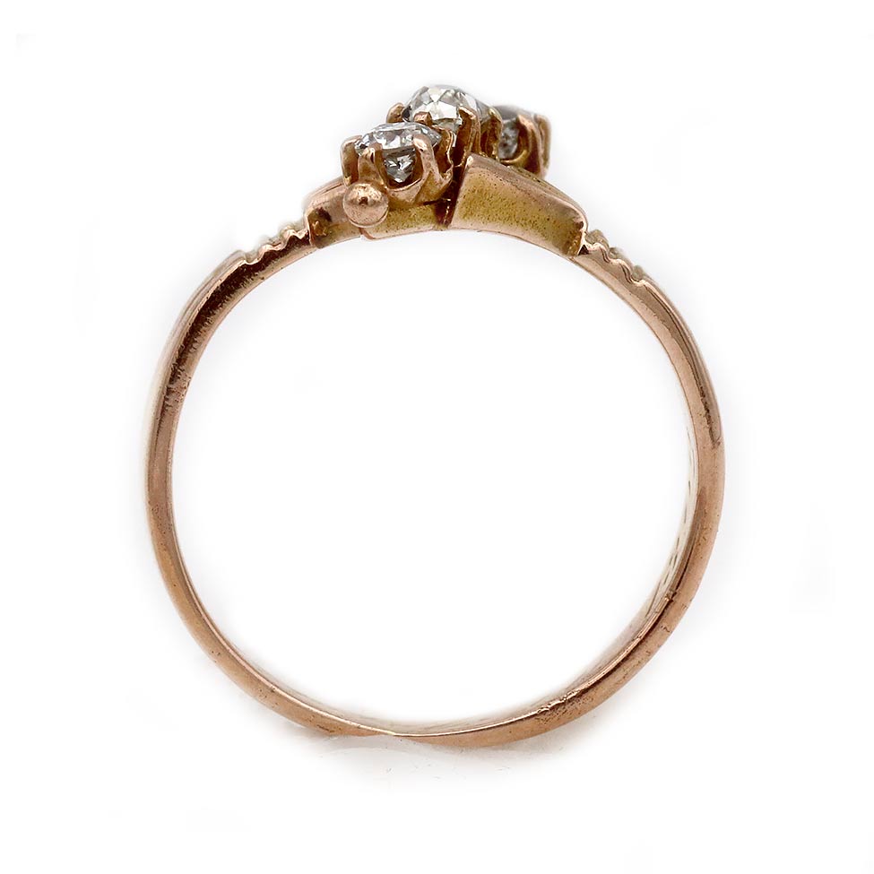 The Layla ring is an authentic vintage diamond engagement ring from the Victorian era circa 1899. The ring features 3 asymmetrically set old mine cut diamonds. Crafted in gleaming 14 karat rose gold, beautifully accentuated with open metal work and intricate filigree engravings. A beautiful jewel, in excellent condition. Signed and stamped "1899."