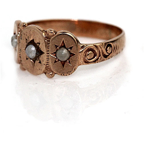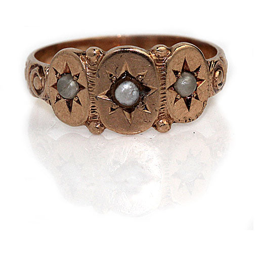 The Minah T ring is an authentic vintage engagement ring from the Victorian era circa 1900s. The ring features 3 vintage seed pearls. Beautifully crafted in 10 karat rose gold setting, accentuated with swirls of open metal work and intricate sunburst engravings. A timeless vintage ring, in very good condition.