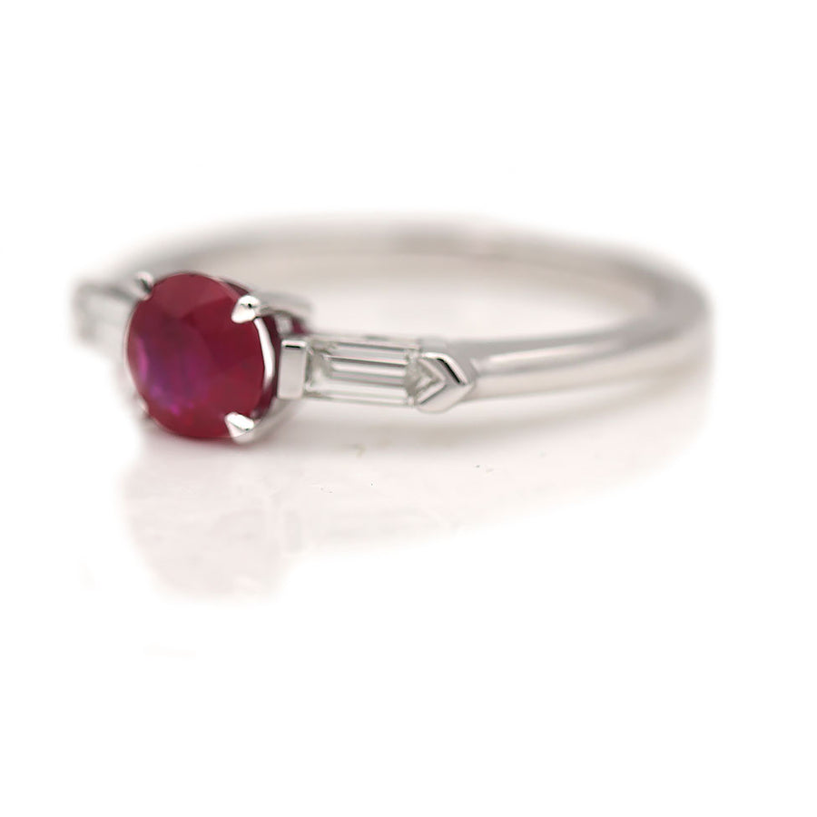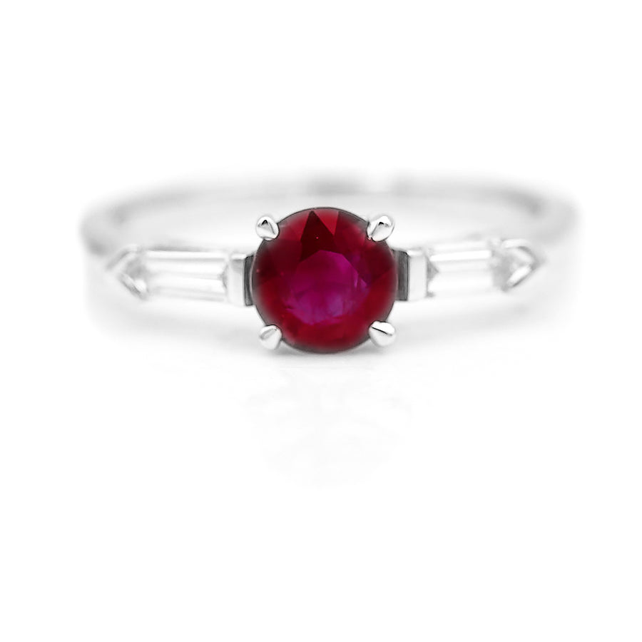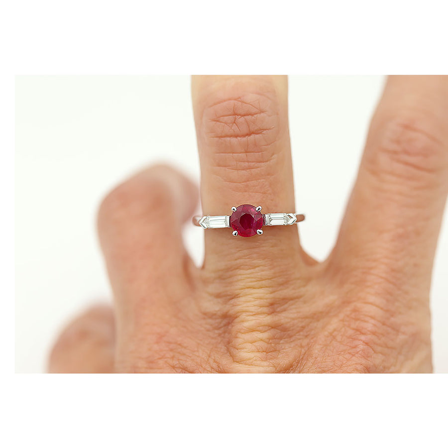 The Helda ring is a vintage style ruby engagement ring using an authentic vintage ruby, along with bullet cut diamonds, circa 1970's. This ring features a .82 carat natural round cut Burma ruby flanked by two (2) bullet cut diamonds. Beautifully crafted in recycled platinum. Made with love in NYC! A stunning natural Burma ruby which spreads the finger beautifully! Magnifique!