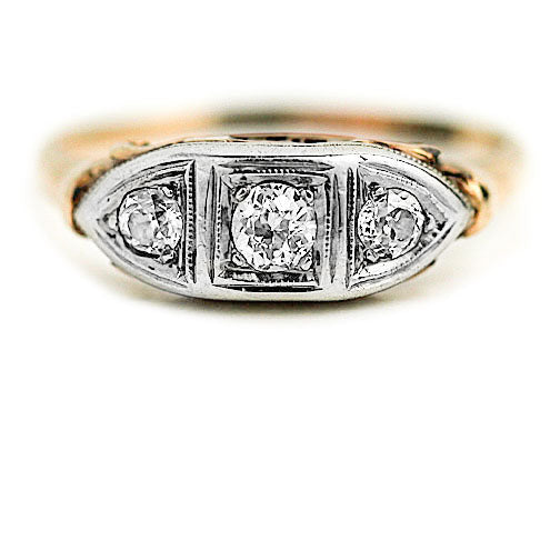 Vintage .40 CTW Mine Cut Diamond 14 Karat Two Tone Three Stone Engagement Ring