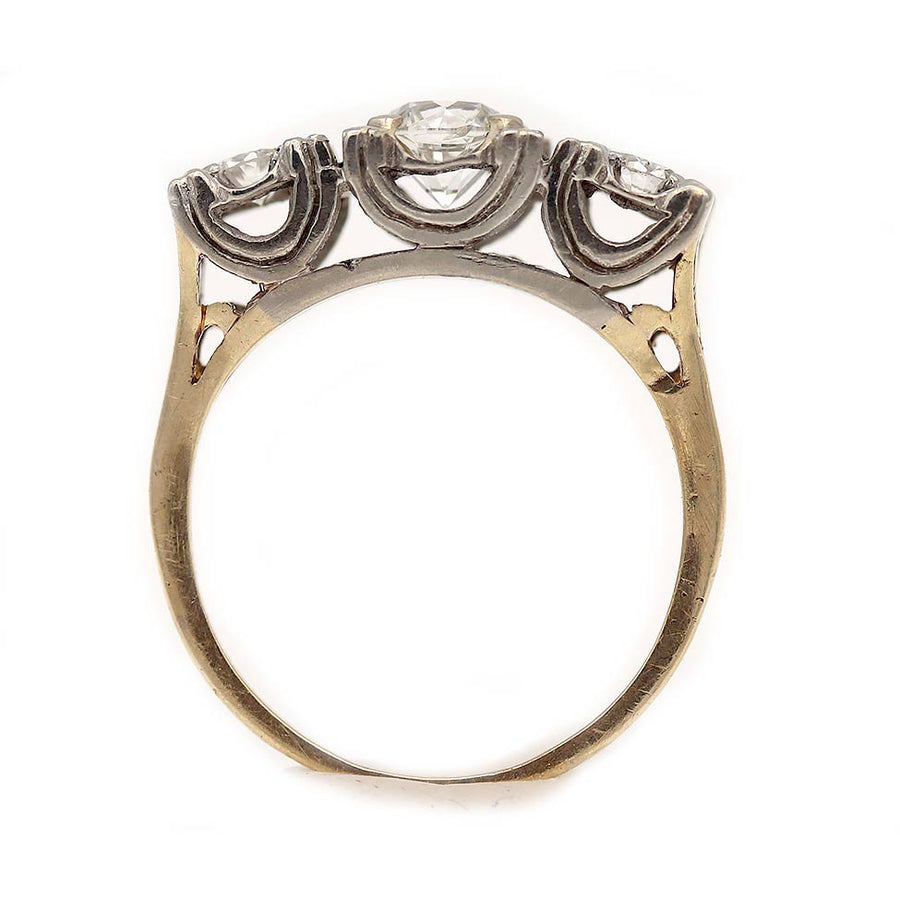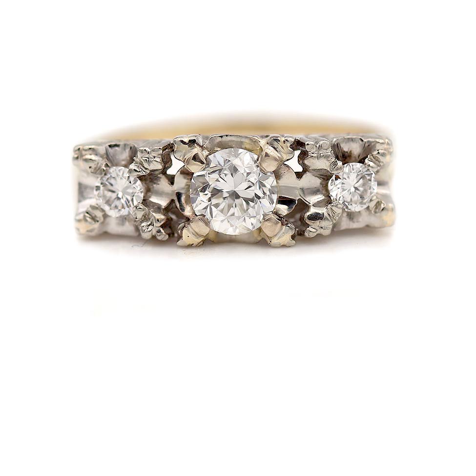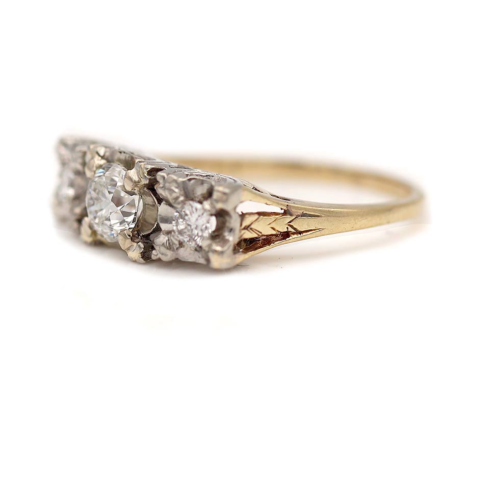 The Lania ring is an authentic vintage 3 stone engagement ring from the 1940s. This ring features a center .65 carat old European cut diamond accompanied by an AGI diamond report stating G color and SI1 clarity, and is flanked by two (2) illusion set transitional cut diamonds weighing .20 carats. Crafted in gleaming 14 kt two tone gold, this is a perfect ring to wear on either hand.