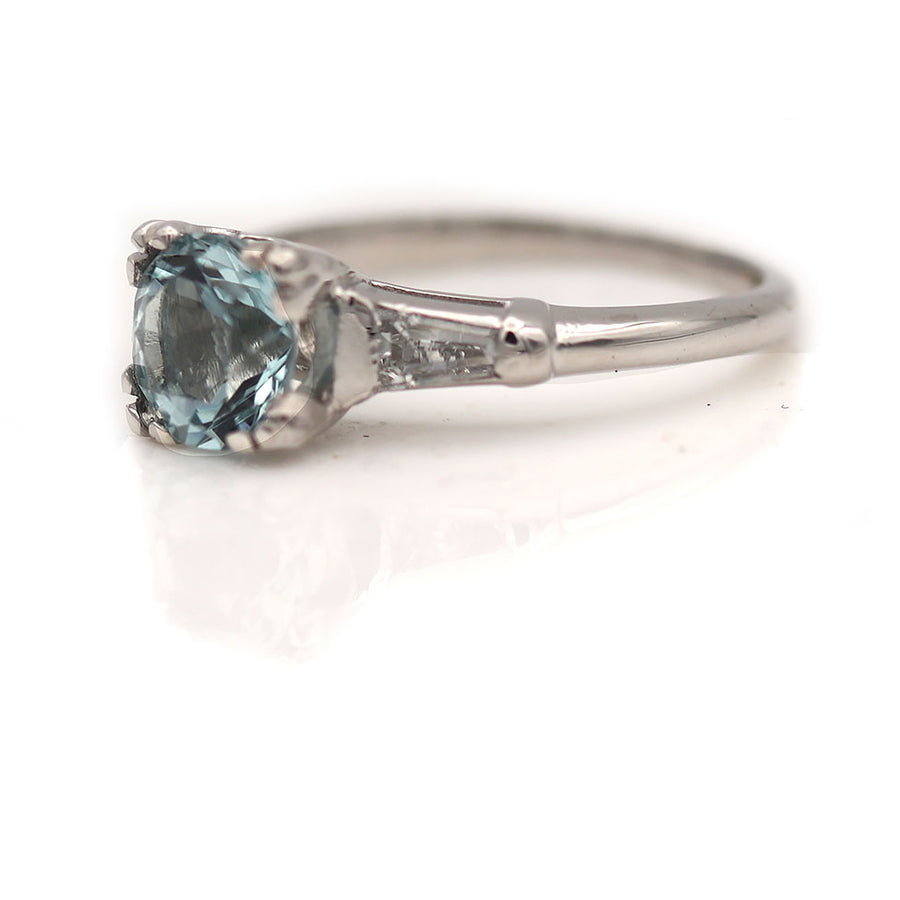 The Dearie ring is an authentic vintage aquamarine engagement ring, circa 1970's. This ring features a natural placid blue .95 carat round cut aquamarine, flanked by two (2) baguette cut diamond accents. Beautifully crafted in platinum, this ring is in very good condition.