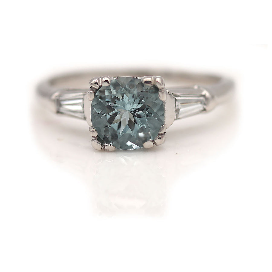Vintage Three Stone Aquamarine Engagement Ring with Side Baguettes