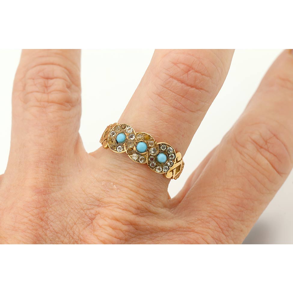 The Barwick ring is an authentic Victorian wedding ring circa 1900s. This original ring features three round natural turquoise stones, framed by twenty-five antique paste glass accents, which were traditionally used in Victorian jewelry to mimic the sparkle of diamonds. Handcrafted in 10 karat rose gold and finished with delicate filigree engraving, this is a charming Victorian piece in very good condition. Perfect to wear on either hand or to stack with other bands.
