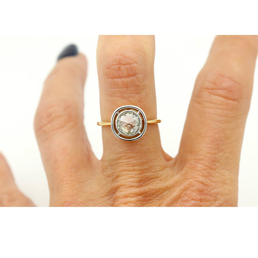 The Ena ring is a VintageDiamondRing.com Victorian style engagement ring featuring an authentic 1920s .75 carat natural bezel set rose cut diamond of J color and SI2 clarity. This diamond resides in a delicate two tiered halo, beautifully crafted in platinum and 18 kt gold. Very hard to find, and as sweet as can be.