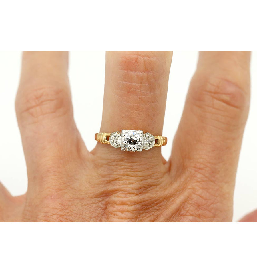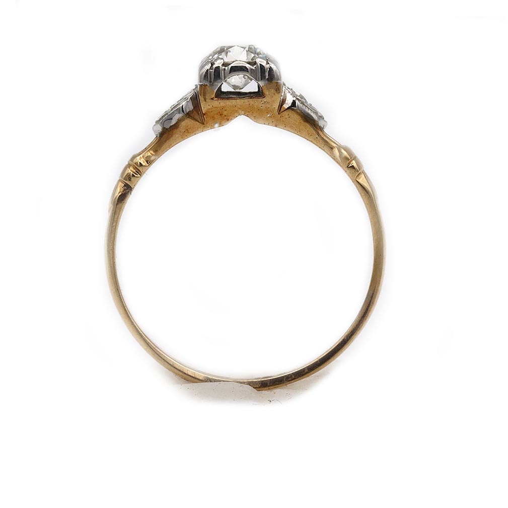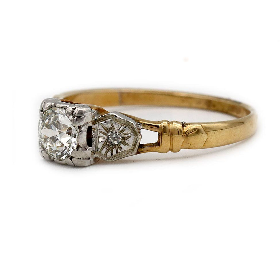 The Colleen ring is an authentic vintage diamond engagement ring circa 1900s. The ring features a dynamic .45 carat old European cut diamond of J color, VS2 clarity, residing within trefoil prongs. The diamond is flanked by a pair of delicate sunburst filigree engravings. Beautifully crafted in 14 karat white gold atop a 14 kt rosy-yellow gold ring, accentuated with open metal work. In excellent condition.