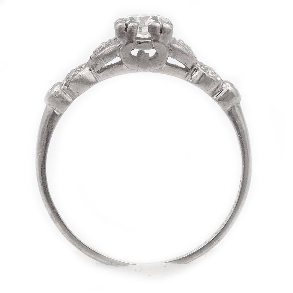 The Ursula ring is an authentic Art Deco engagement ring dating to the 1930s. It features a bright white .35 ct old European cut diamond of H color and I1 clarity, set within distinctive trefoil prongs. The center stone is flanked by eight single cut diamond accents that add gentle sparkle and balance. Crafted in platinum, the setting is adorned with delicate milgrain engravings characteristic of the period. A sweet and refined Art Deco engagement ring with the perfect touch of vintage patina, preserved in good vintage condition.