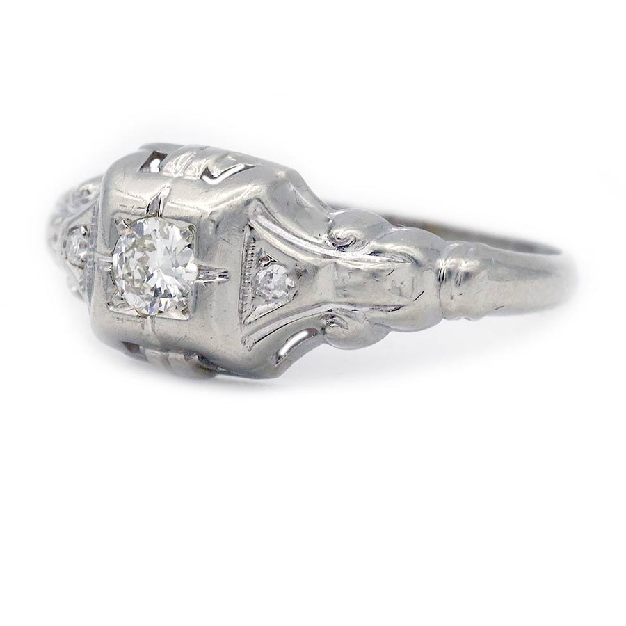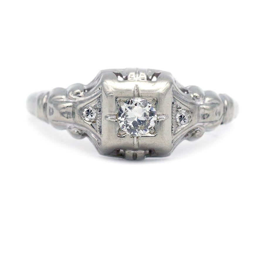 The Indie ring is an authentic Art Deco diamond engagement ring dating to the 1930s. It features a bright-white .15 carat Old European cut diamond, graded I color and VS2 clarity, set within a geometric square frame. The center stone is flanked by two single-cut diamond accents. Beautifully crafted in 18 karat white gold and finished with delicate milgrain engraving, this classic Art Deco jewel shows the perfect amount of patina, highlighting its vintage character. Offered in good vintage condition.