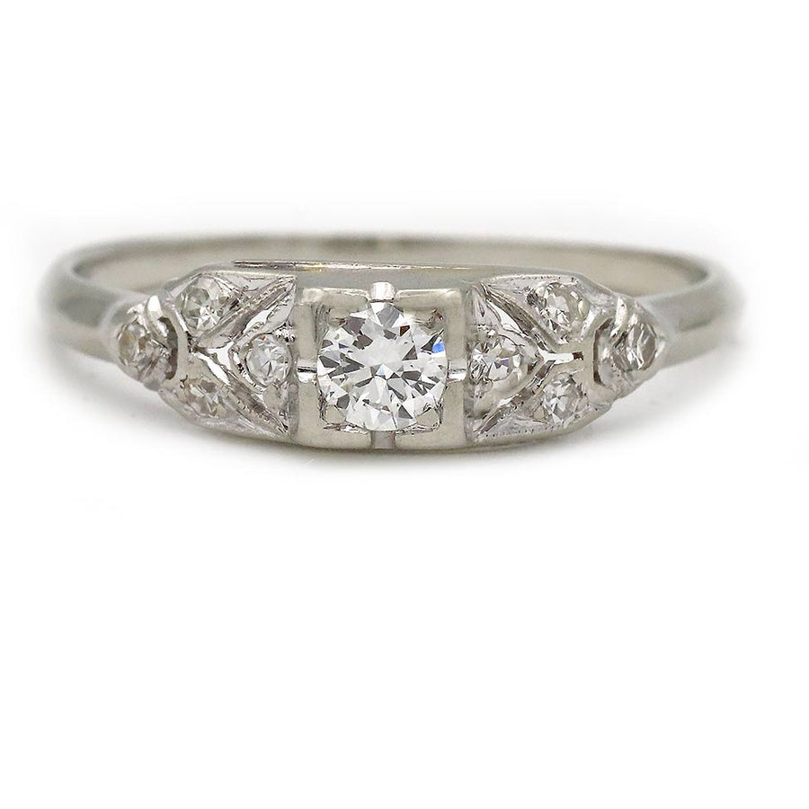 The Maxine ring is an authentic Art Deco–era engagement ring dating to the 1930s. It features a .20 carat old European cut diamond, graded F color and VS2 clarity, set within a sharp geometric square frame. The center stone is accented by eight single cut diamonds. Crafted in 18 karat white gold and finished with delicate milgrain detailing, this timeless Art Deco ring is offered in very good condition.