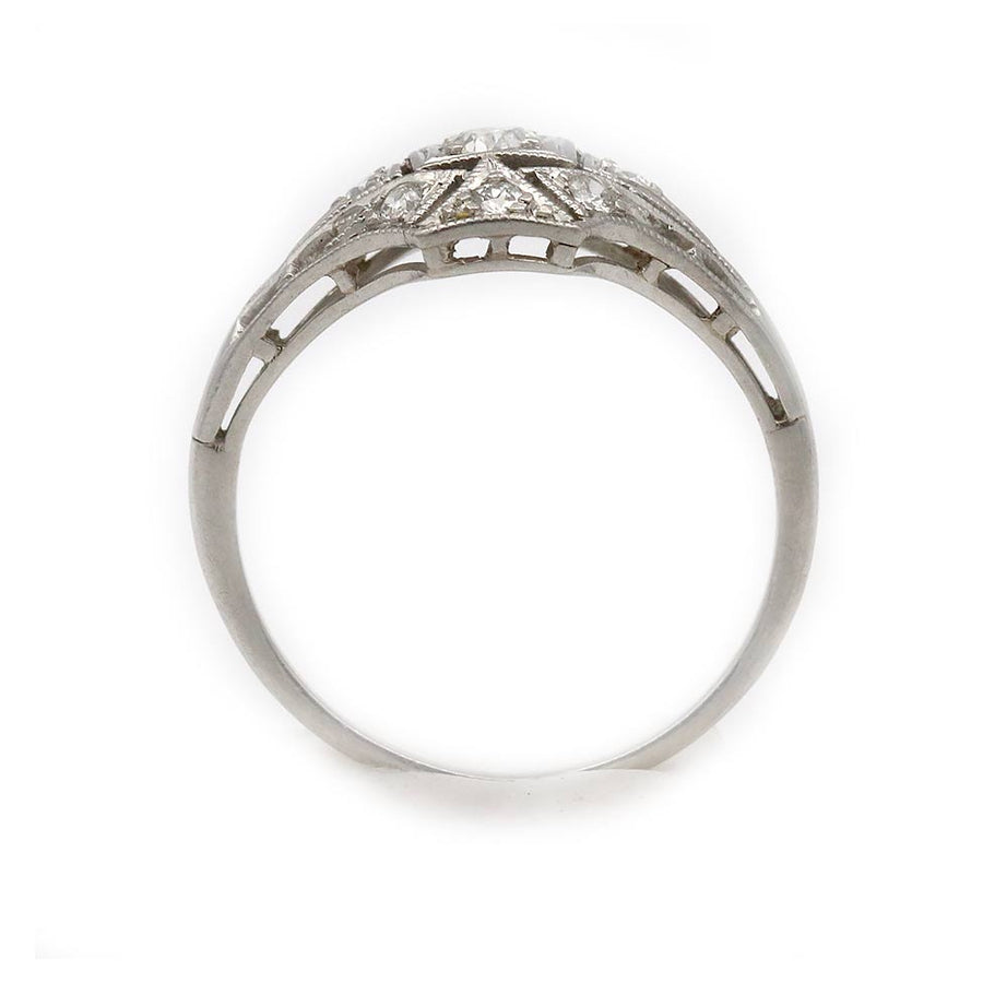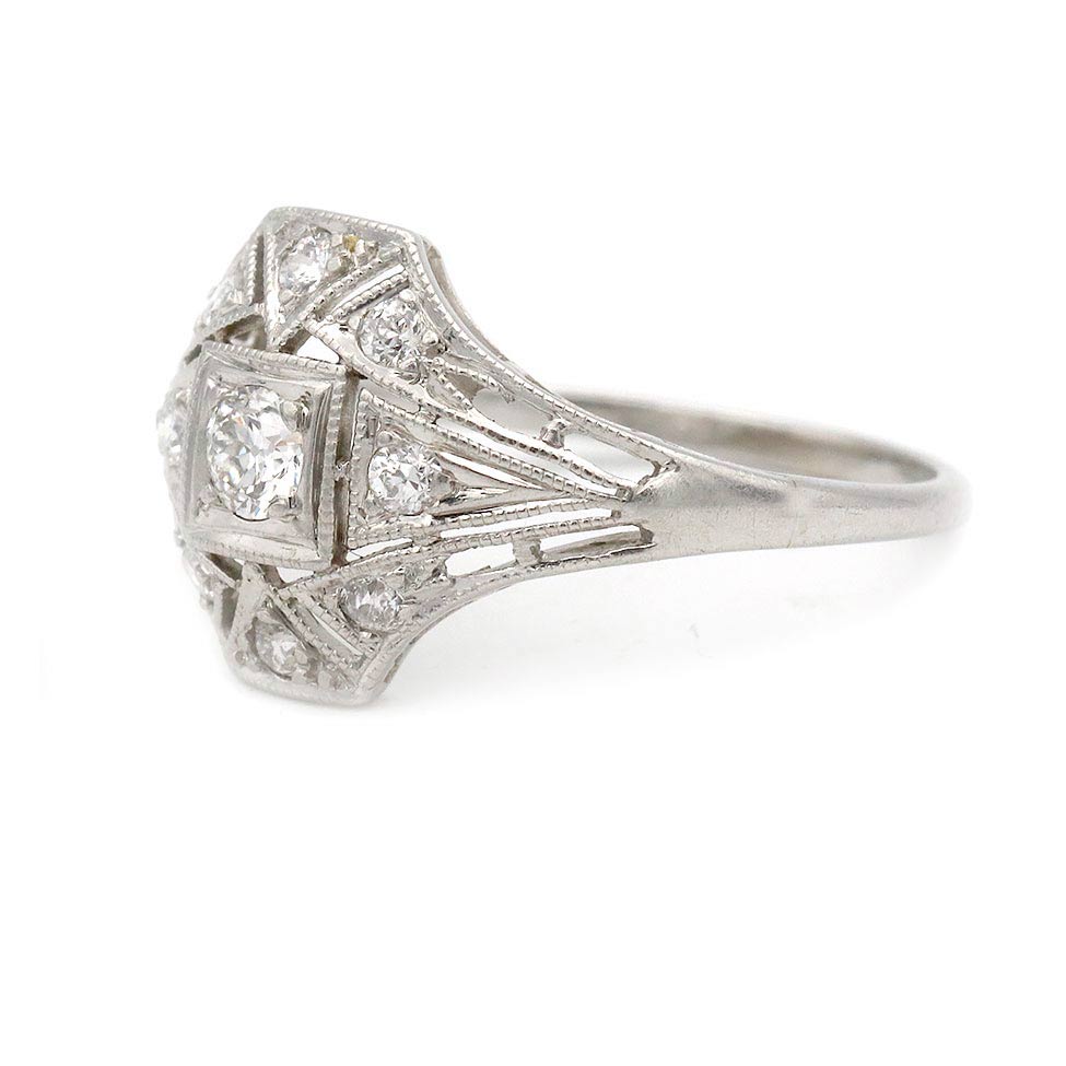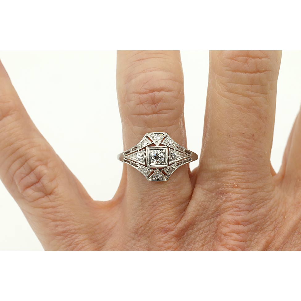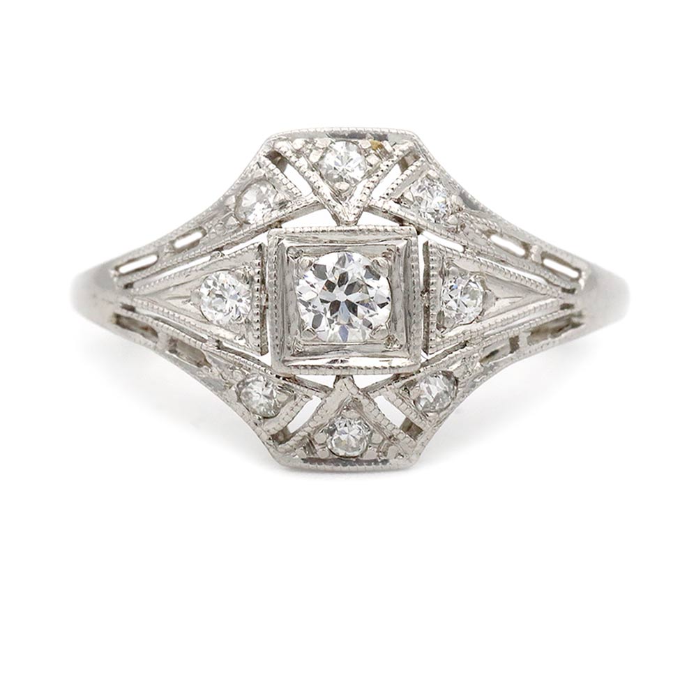The Kelly ring is an authentic Art Deco–era engagement ring dating to the 1930s. It features a .15 carat old European cut diamond, graded F color and VS2 clarity, set within a crisp geometric square frame. The center diamond is surrounded by eight old mine cut diamond accents. Beautifully crafted in 14 karat white gold, the ring is finished with open metalwork and delicate milgrain detailing. A classic and refined vintage piece, offered in very good condition.
