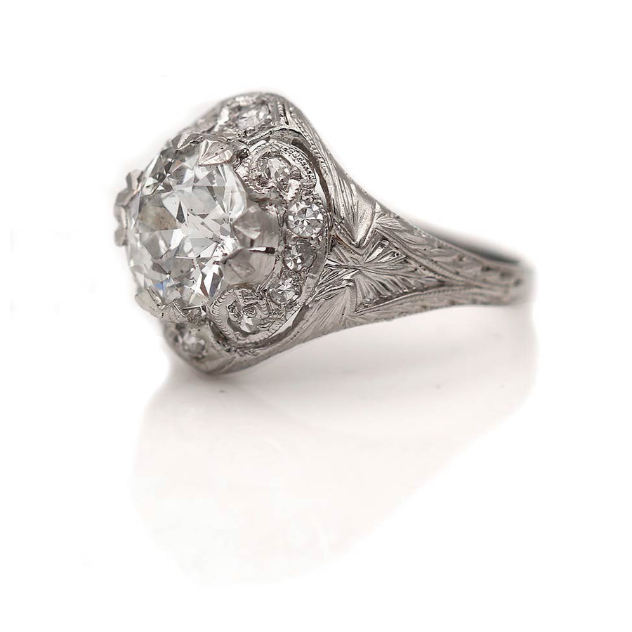 The Sirenna ring is a striking, authentic Art Deco engagement ring dating to the 1930s. At its center is a dynamic GIA-certified 2.11 carat Old European cut diamond, graded I color and I1 clarity, offering bold vintage brilliance. Twelve single-cut diamond accents surround the center stone, enhancing its presence and sparkle. Beautifully crafted in platinum and finished with intricate milgrain and delicate filigree engraving, this exceptional Art Deco ring is offered in very good condition.