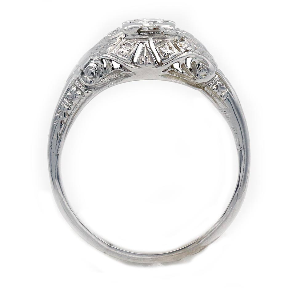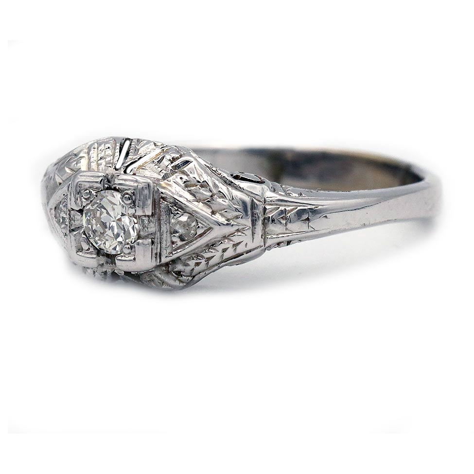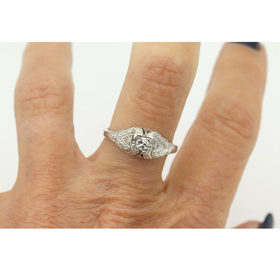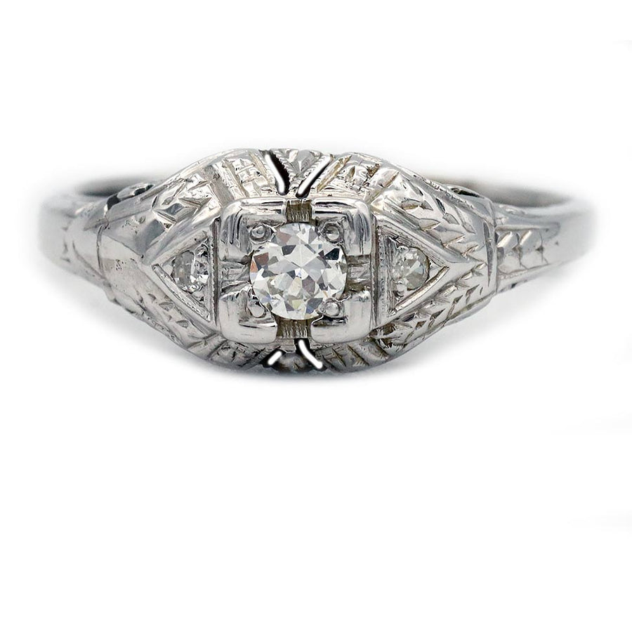 The Zoe ring is an authentic vintage engagement ring from the Art Deco era, dating to the 1930s. It features a .15 ct old European cut diamond of F color and VS2 clarity, set within a crisp geometric square frame. The center stone is flanked by two single cut diamond accents that add subtle sparkle and balance. Handcrafted in 14K white gold, the setting is adorned with elegant swirls of open metalwork and delicate filigree engravings characteristic of the period. A sweet and refined Art Deco engagement ring, preserved in good vintage condition.