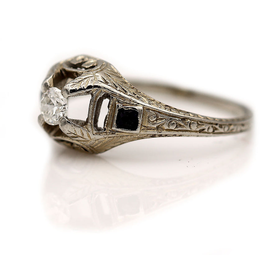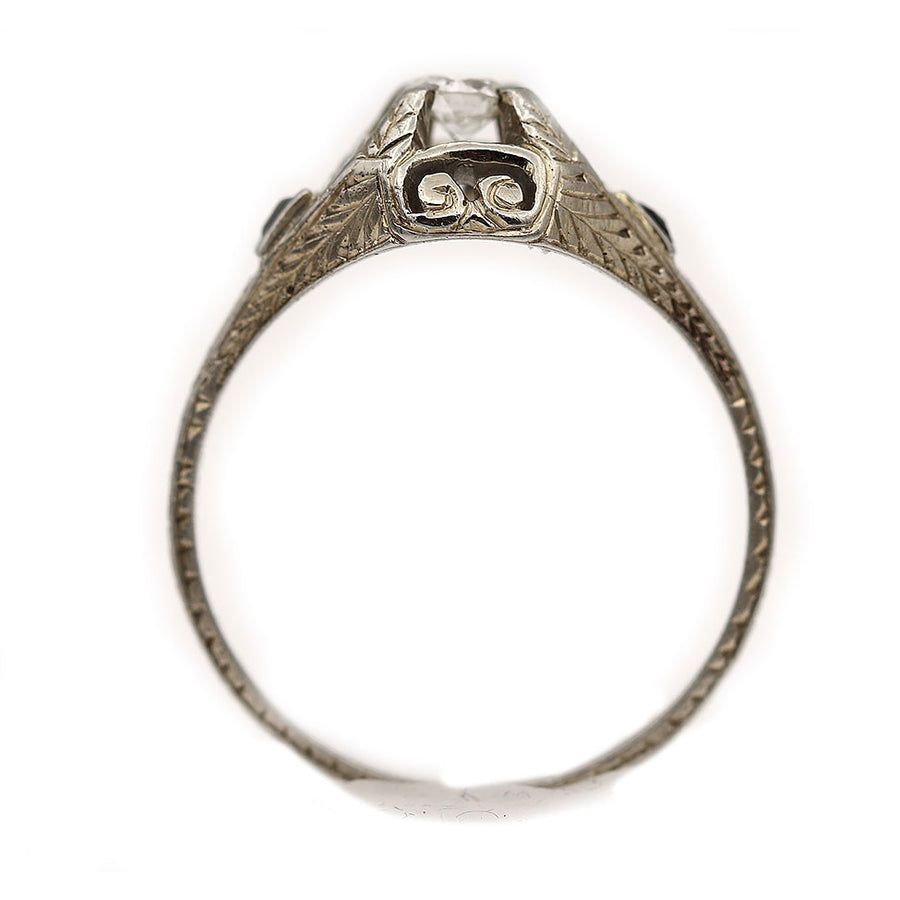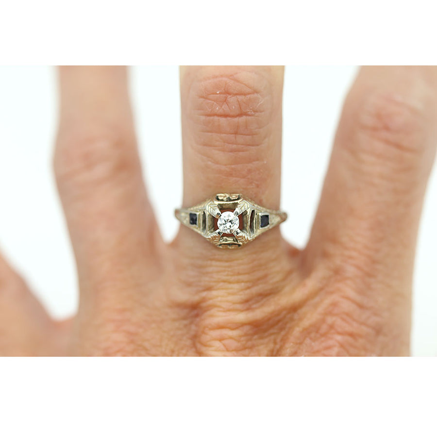 The Sharen ring is an authentic vintage diamond and sapphire engagement ring from the Art Deco era circa 1920s. The ring features a .20 carat old European cut diamond of F color, SI2 clarity. The diamond is flanked by 2 synthetic square cut sapphires. Crafted in 14 karat white gold, completed with intricate filigree engravings and swirls of metal work. A classic vintage piece, with beautiful filigree detailing. In very good condition.