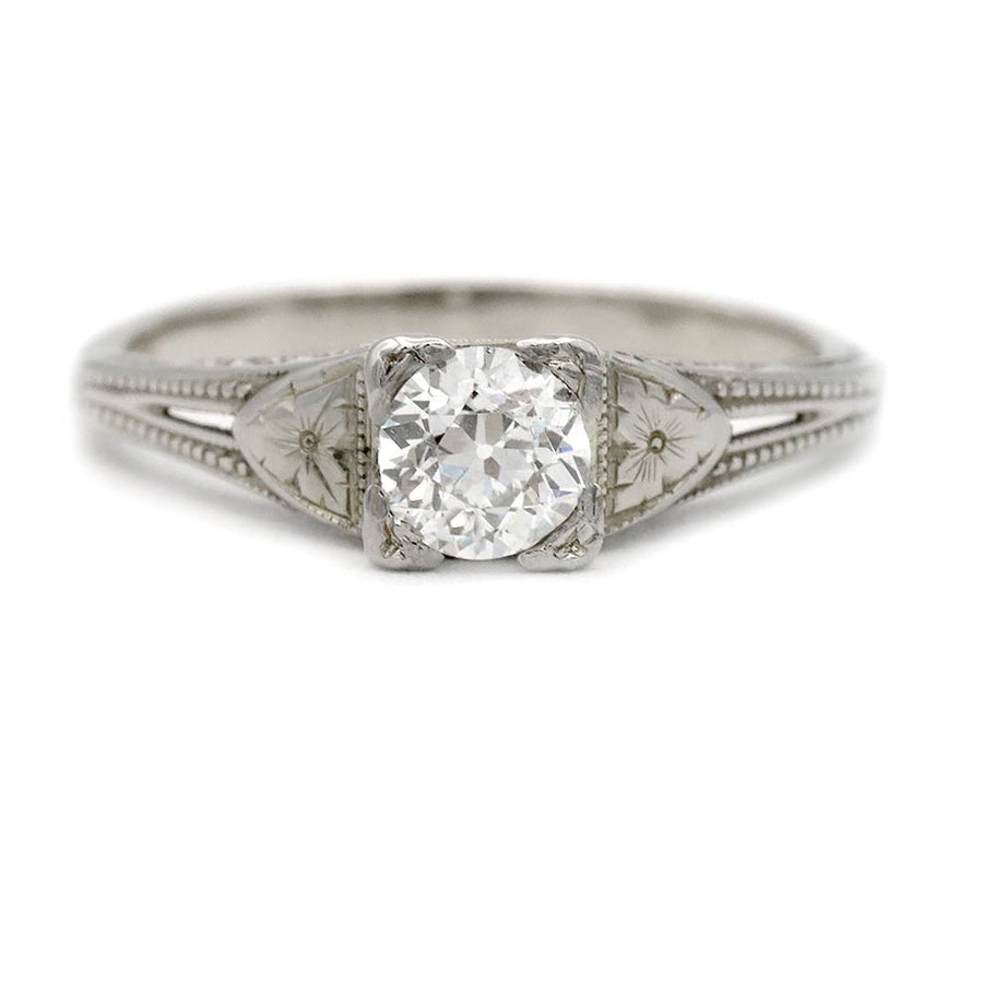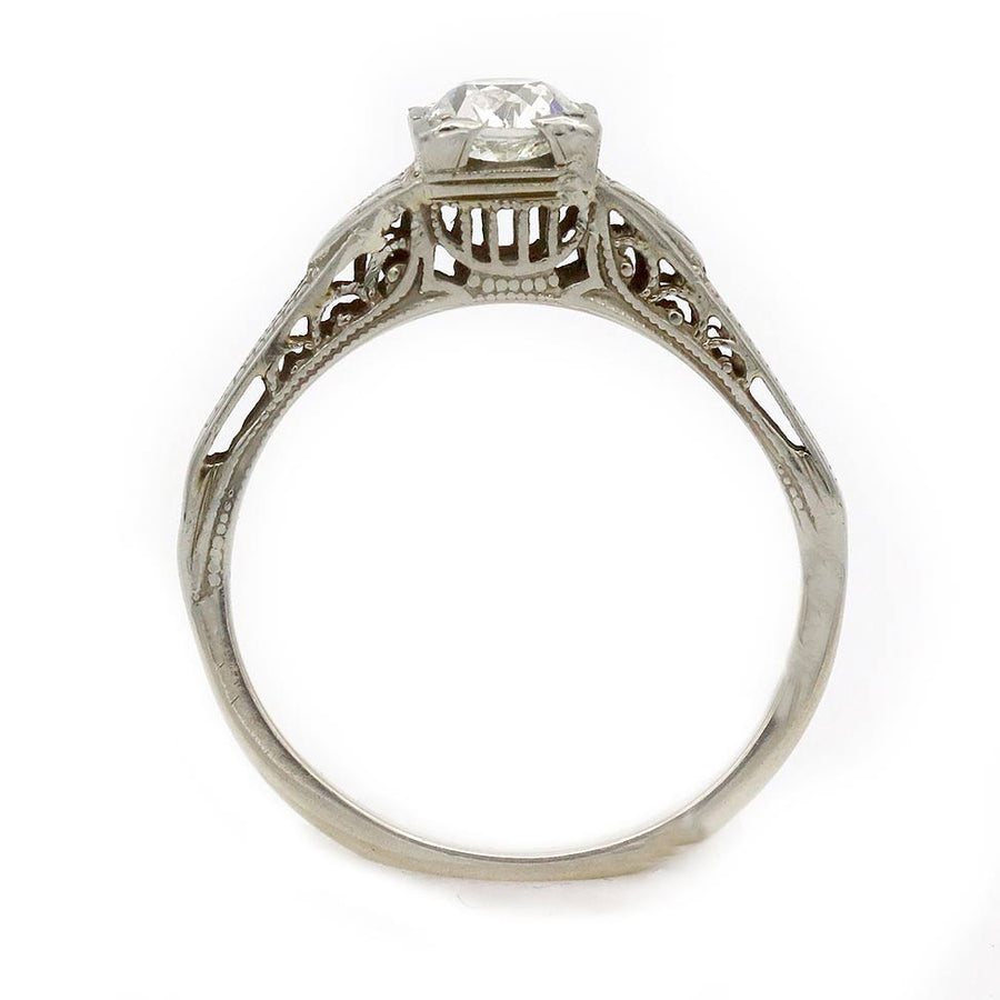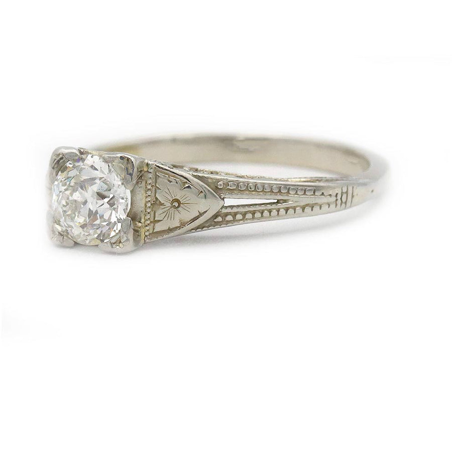 The Mianta ring is an authentic vintage engagement ring from the Art Deco era, circa 1930s. This ring features a glittering GIA certified .49 carat old mine cut diamond of K color and SI1 clarity. Crafted in 14 kt white gold, notice the accentuated intricate milgrain and filigree engravings with a slight split shank. A petite and very pretty vintage ring, in good condition.