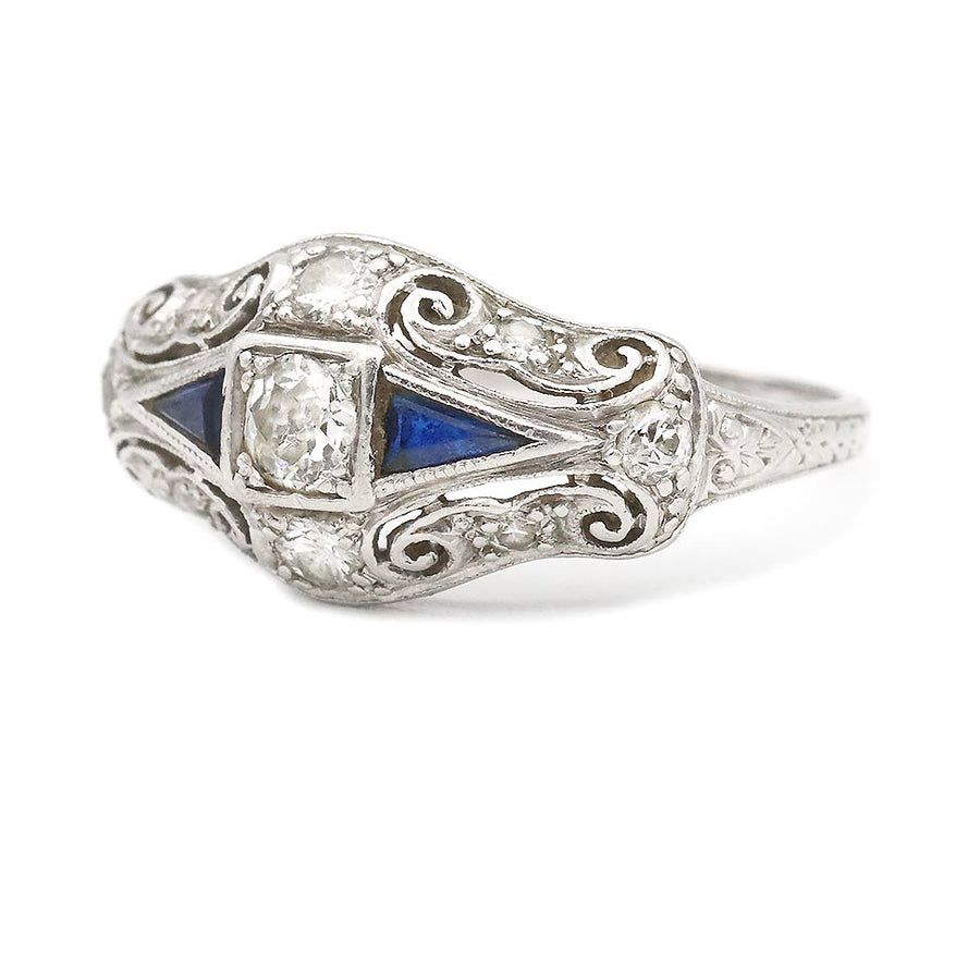 The Bergen ring is an authentic Art Deco sapphire engagement ring dating to the 1930s. The ring centers a bright-white .20 carat Old Mine cut diamond, flanked by two synthetic kite-shaped sapphires and accented by eight Old Mine cut diamonds. Crafted in platinum, the setting features open metalwork with delicate filigree engravings characteristic of Art Deco design. A scarce period example, the ring is preserved in good vintage condition.