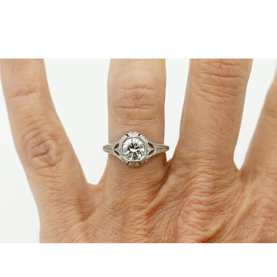 The Missie ring is an authentic Art Deco engagement ring dating to the 1930s. It centers a .68 carat GIA-certified Old European cut diamond, graded H color and VS2 clarity, set within a geometric octagonal frame. The center stone is flanked by open navette motifs that add elegant architectural detail. Beautifully crafted in platinum and finished with subtle metalwork and delicate filigree, this low-profile Art Deco ring is a rare vintage piece, offered in very good condition.