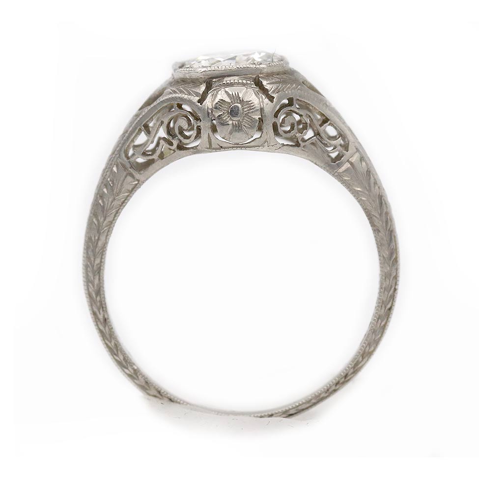 The Missie ring is an authentic vintage engagement ring from the Art Deco Era circa 1930s. The ring features a .68 carat GIA certified old European cut diamond of H color, VS2 clarity, residing in a geometric octagonal frame, flanked by open navette frames. Beautifully crafted in gleaming platinum, accentuated with swirls of metal work and filigree engravings. A rare, one of a kind vintage treasure. In excellent condition.
