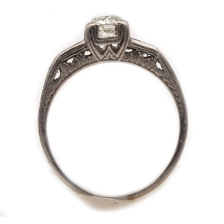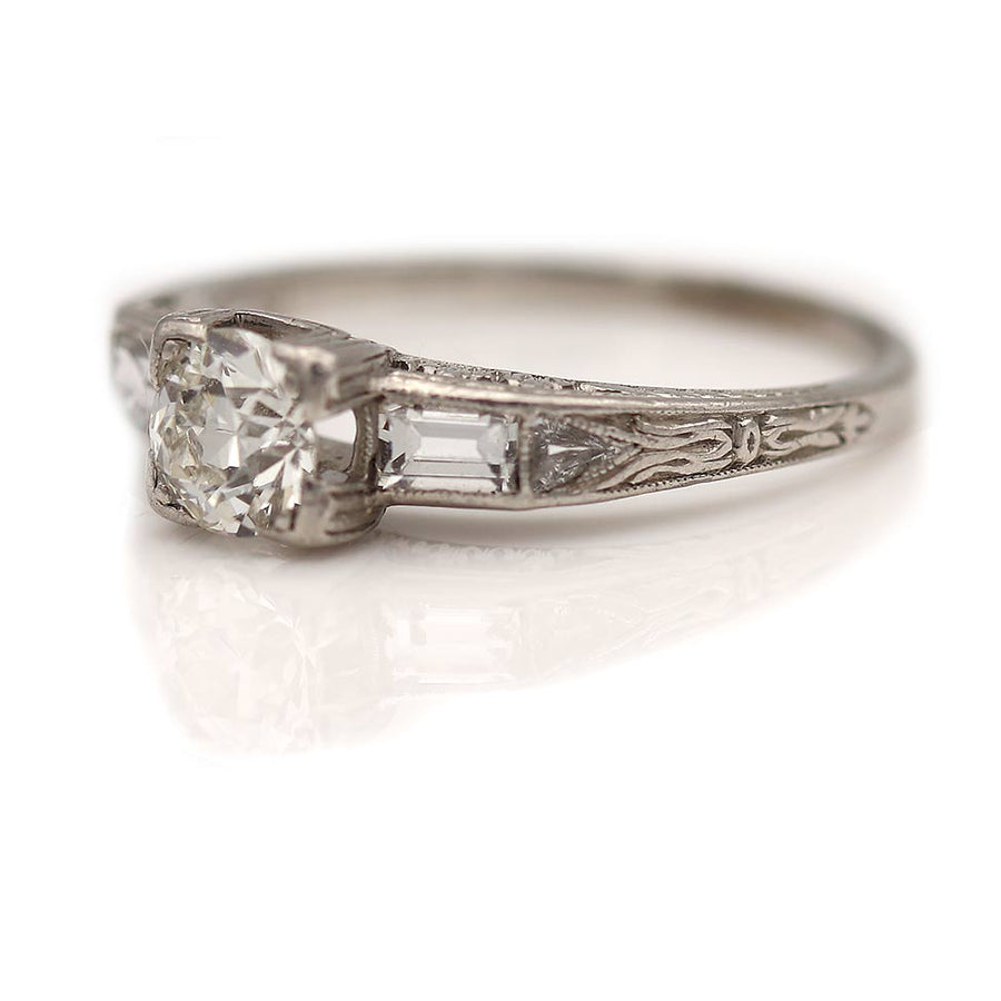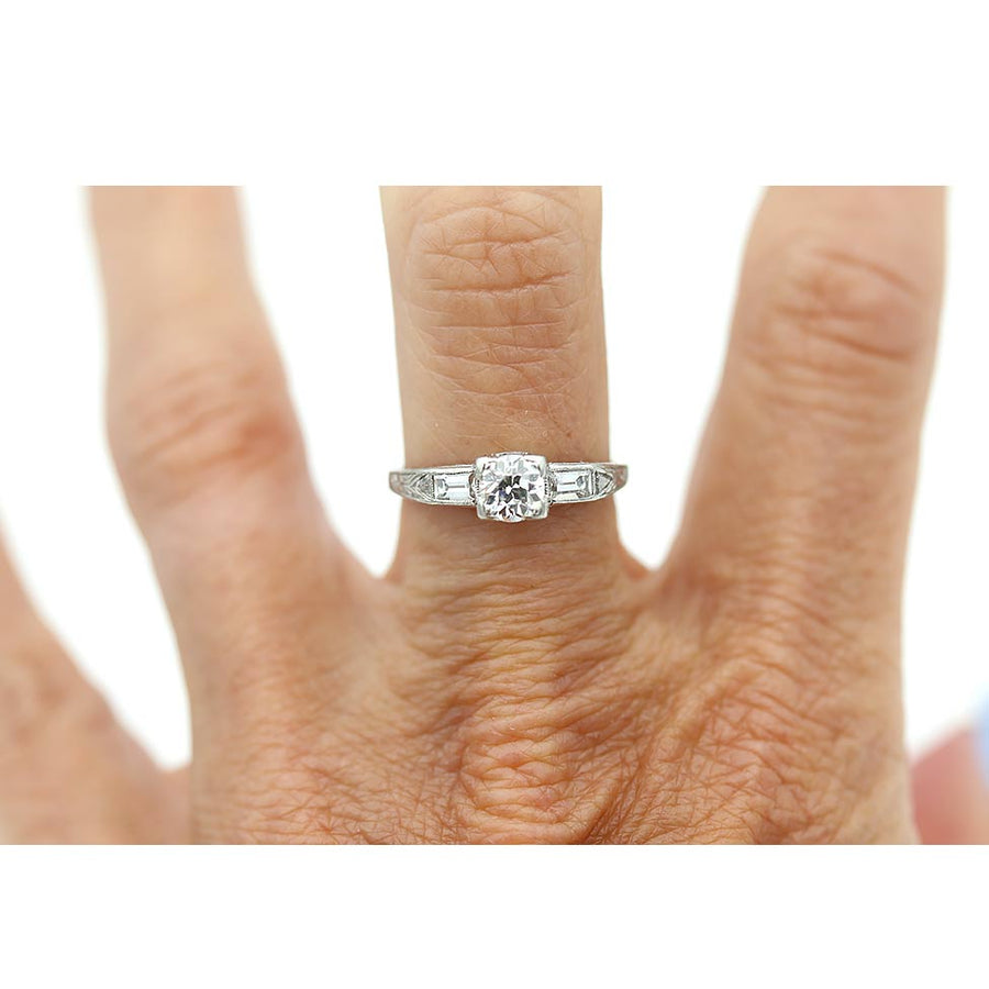 The Jude ring is an authentic vintage engagement ring from the Art Deco era, dating to the 1930s. It features an AGI-certified .50 carat old European cut diamond set within a crisp geometric square frame. The center stone is flanked by two straight baguette diamonds and two kite-shaped diamond accents, creating striking symmetry and contrast characteristic of Art Deco design. Beautifully crafted in platinum and finished with intricate filigree engraving, this bold and timeless vintage engagement ring is offered in good vintage condition.
