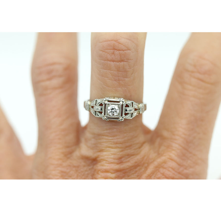 Art Deco .20ct Old European Cut Diamond 18K White Gold Geometric Ring