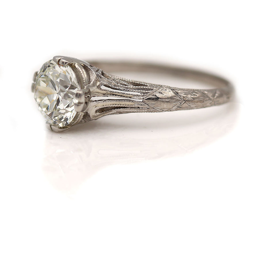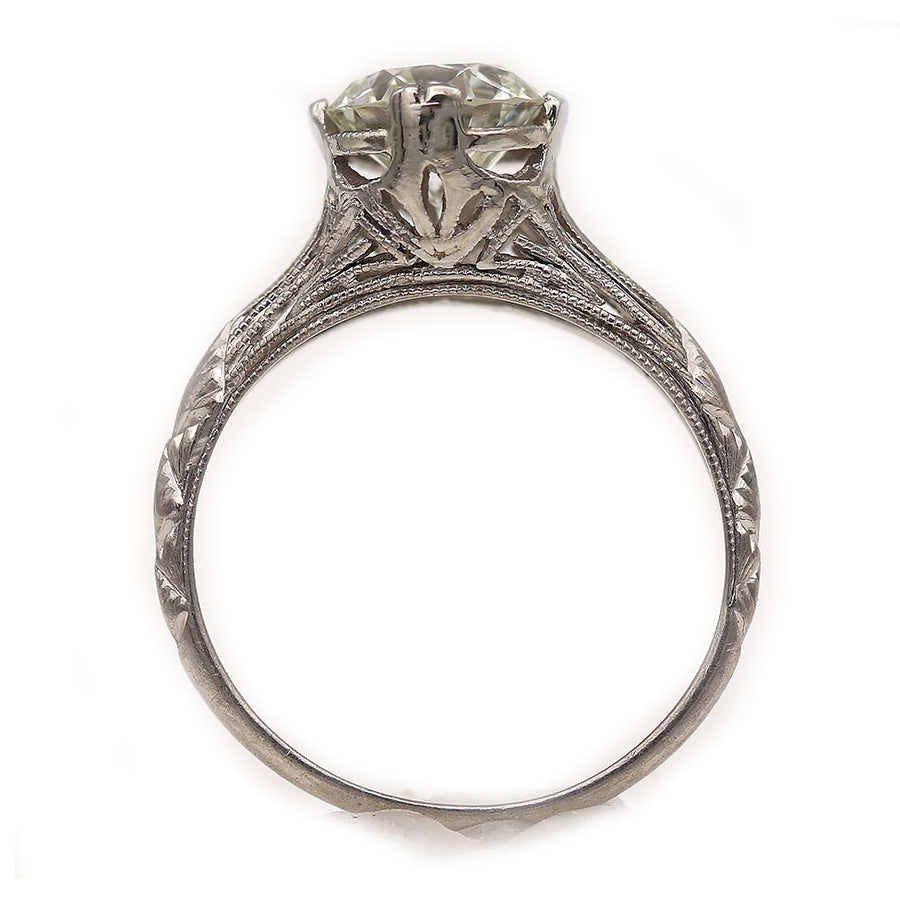 The Amiletta ring is an authentic vintage solitaire engagement ring from the Art Deco era, dating to the 1930s. At its center is a GIA-certified 1.63 carat Old European cut diamond, graded J color and VS2 clarity, prized for its soft antique brilliance and elegant proportions. Crafted in platinum, the setting features graceful open metalwork, delicate filigree engraving, and fine milgrain detailing—hallmarks of refined Art Deco craftsmanship. A timeless and understated vintage solitaire, offered in very good condition.